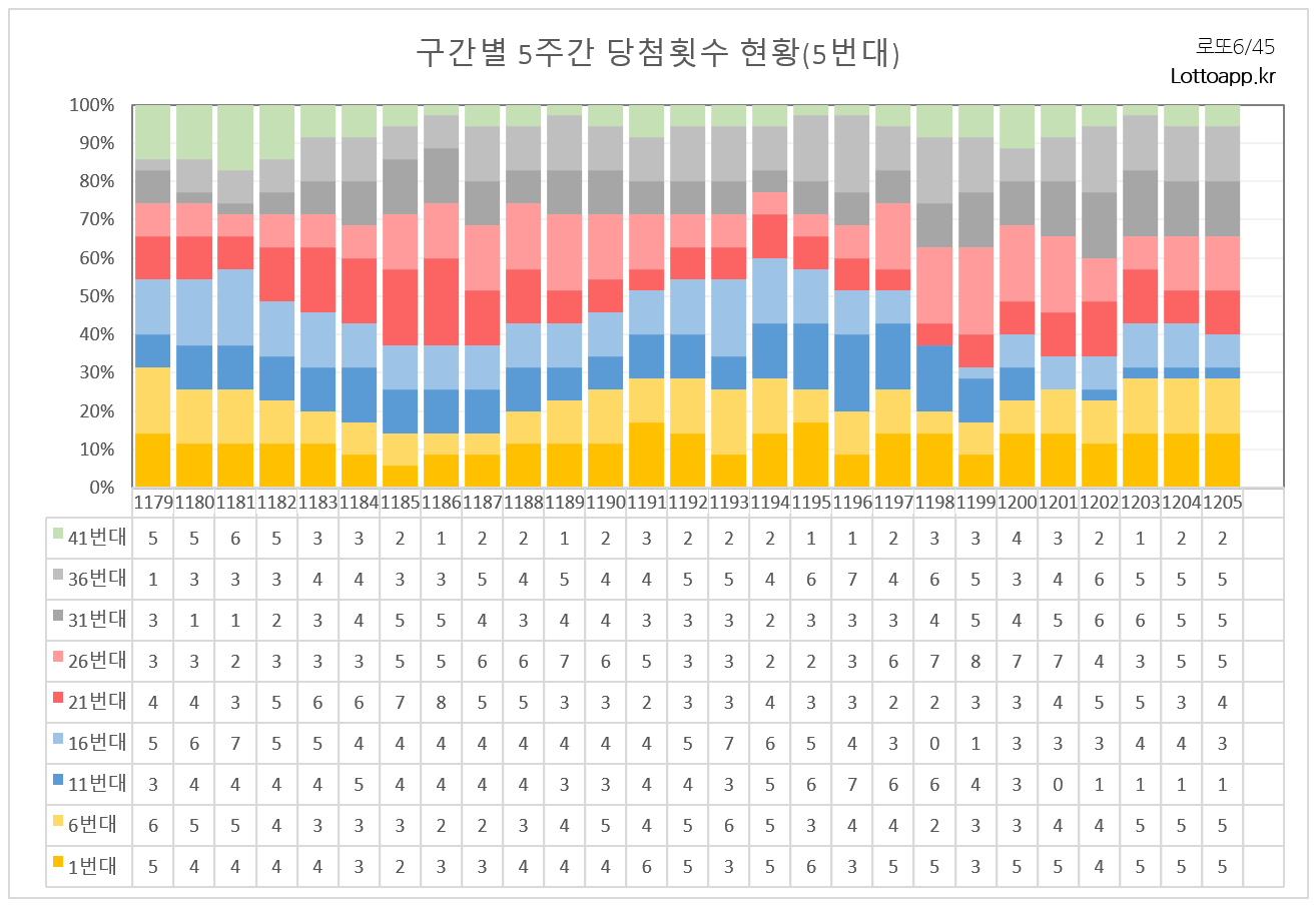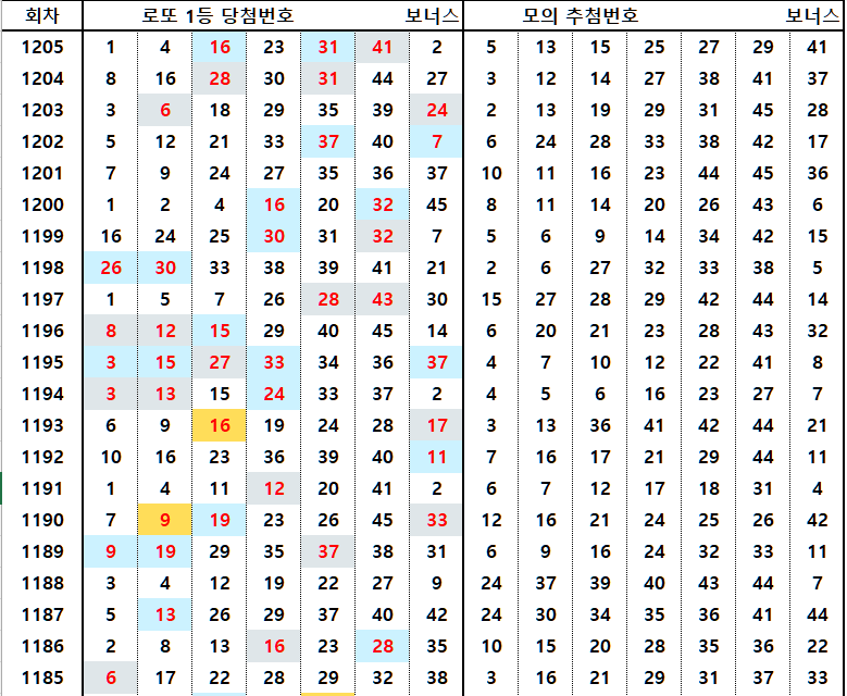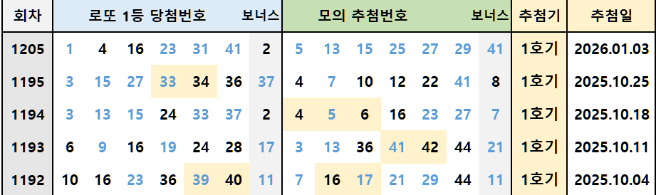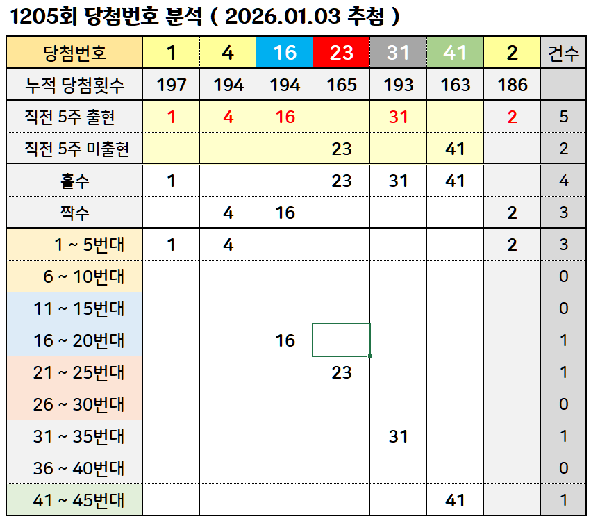 이 번호들은 최근 5주간 1회씩 출현한 번호들입니다. 1205회에서는 이 그룹에서 1, 4, 41, 23번이 당첨되었습니다.