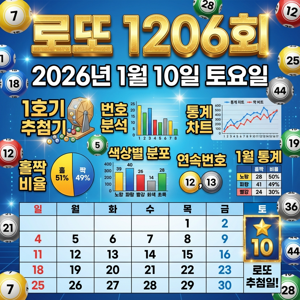 2026년 1월 10일 토요일, 로또 1206회 당첨번호 추첨일이 다가왔습니다. 이번주 로또 예상번호 찾고 계신가요? 2026년 새해 두 번째 로또이자 1월 추첨으로, 1호기 추첨기가 사용되는 중요한 회차입니다. 1205회 로또 1등 2등 당첨지역 정보부터 역대 당첨번호 통계, 1월 최다 당첨번호, 홀짝수 비율, 색상별 분포, 연속쌍 패턴, 모의번호 분석까지 모든 것을 상세히 다룹니다. 특히 1호기 추첨기에서 최근 높은 출현율을 보인 번호들과 1월 계절 통계를 집중 분석했습니다.