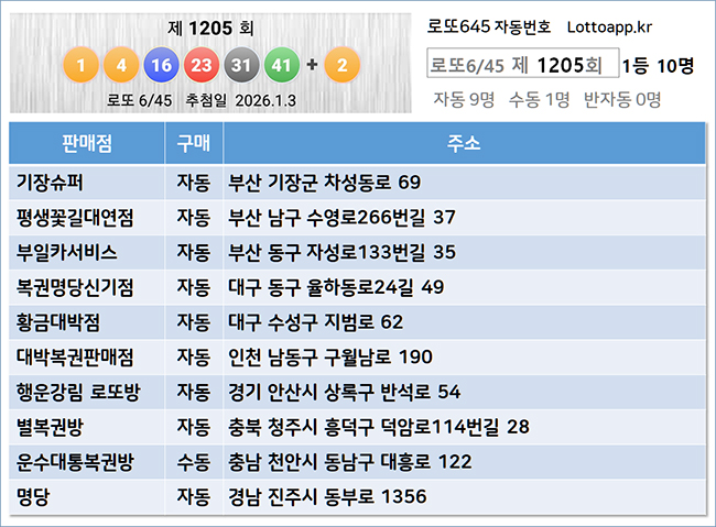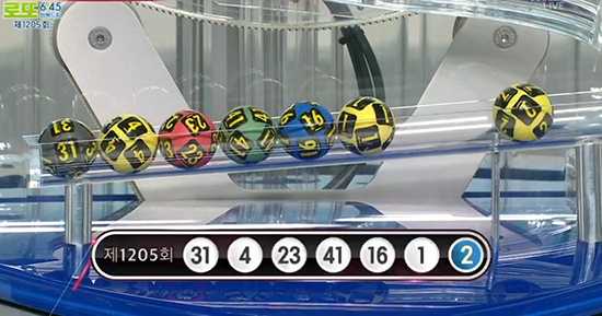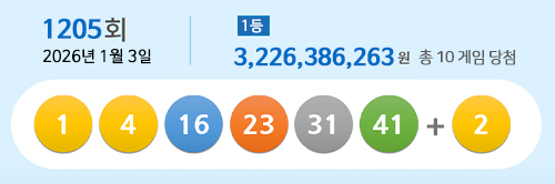 2026년 1월 3일 토요일, 1호기 추첨기에서 추첨된 1205회 로또 당첨번호는 1, 4, 16, 23, 31, 41이며, 보너스 번호는 2입니다.
