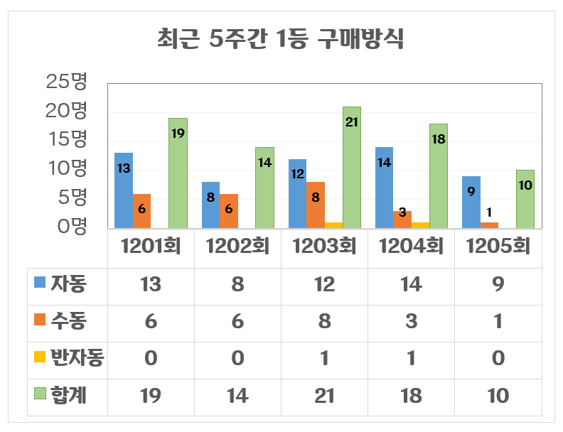 1등 당첨자의 자동/수동/반자동 선택 방식도 확인할 수 있어, 최근 어떤 방식으로 당첨자가 많이 나오는지 트렌드를 파악할 수 있습니다. 이번 1205회의 경우 자동 9명, 수동 1명으로 자동 방식이 압도적이었습니다.
