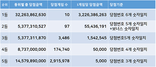 1등 당첨자는 총 10명으로, 1인당 당첨금액은 정확히 3,226,386,263원입니다. 총 당첨금액은 322억 6,386만 2,630원에 달했습니다.