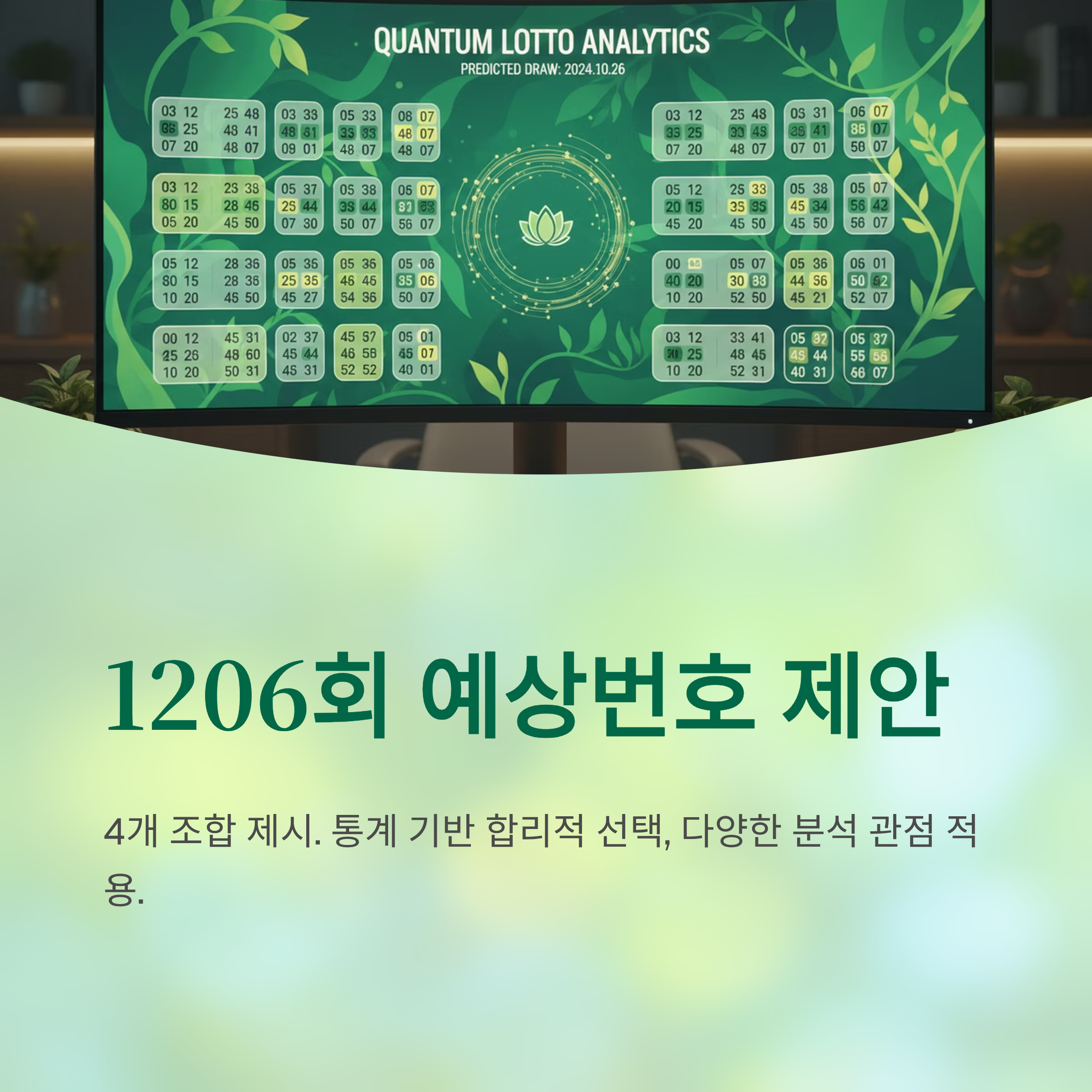 지금까지 분석한 내용을 바탕으로 1206회 로또 예상번호 4개 조합을 제안해 드립니다. 각 조합은 서로 다른 분석 기준을 적용하여 다양한 관점에서 번호를 선정했습니다.