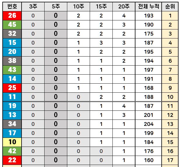 0회 출현 번호 (약세/잠재력): 26, 45, 32, 15, 20, 38, 43, 14, 25, 11, 19, 13, 34, 17, 10, 42, 22번