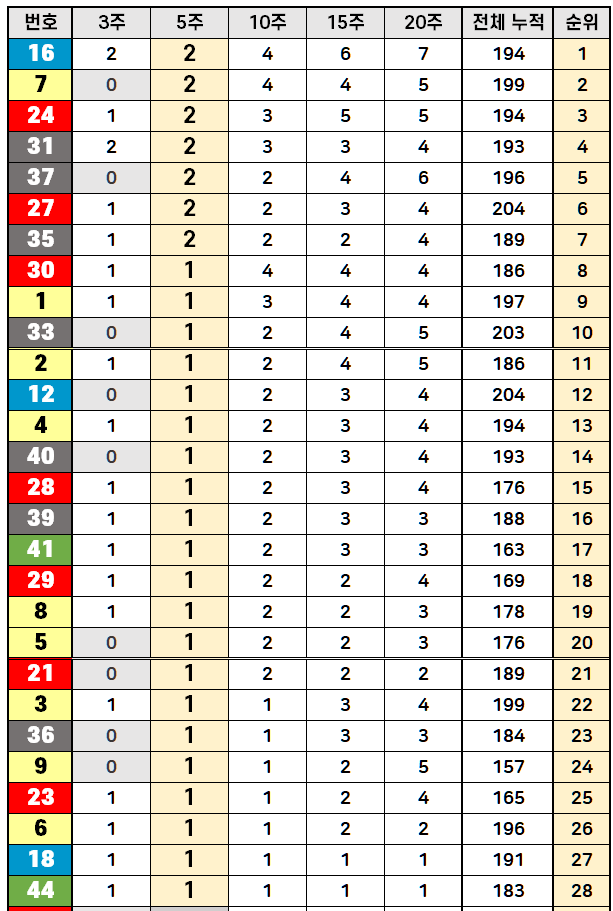 3번(노랑색, 1~10): 역대 누적 199회로 상위권입니다. 최근 5주간 1회 출현으로 적당한 활동성을 보입니다.