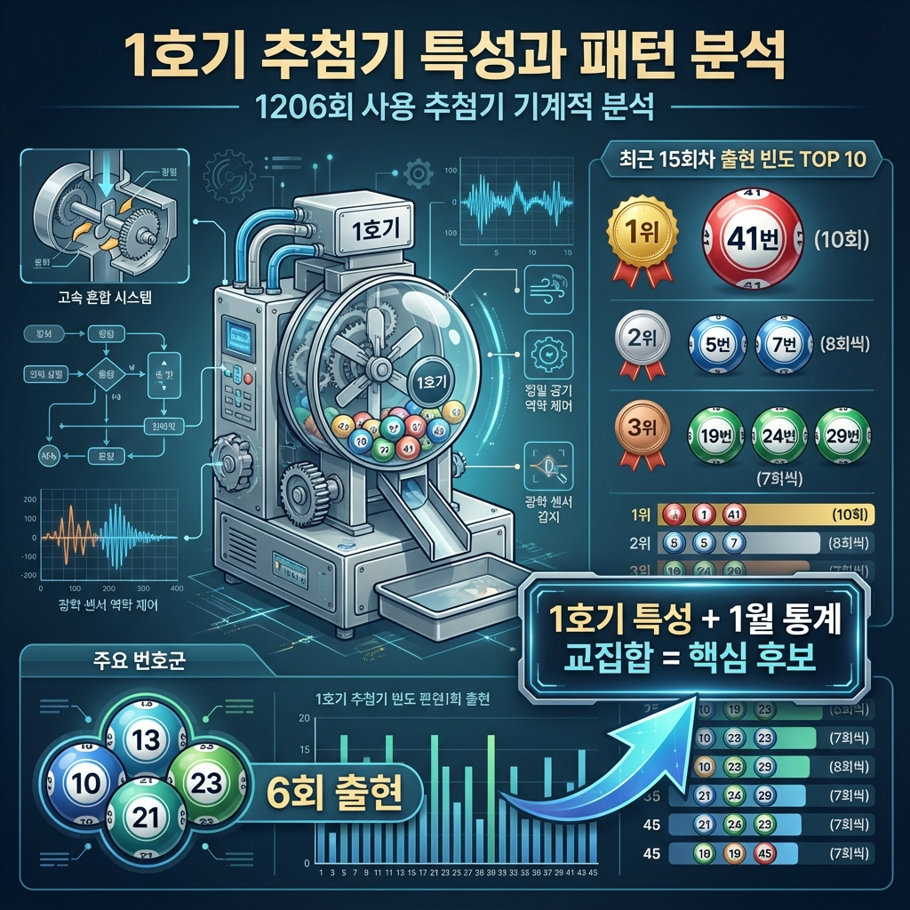 1206회는 1호기 추첨기를 사용합니다. 추첨기마다 미세한 기계적 특성이 있어 특정 번호가 더 자주 나올 수 있다는 분석 결과가 있습니다.