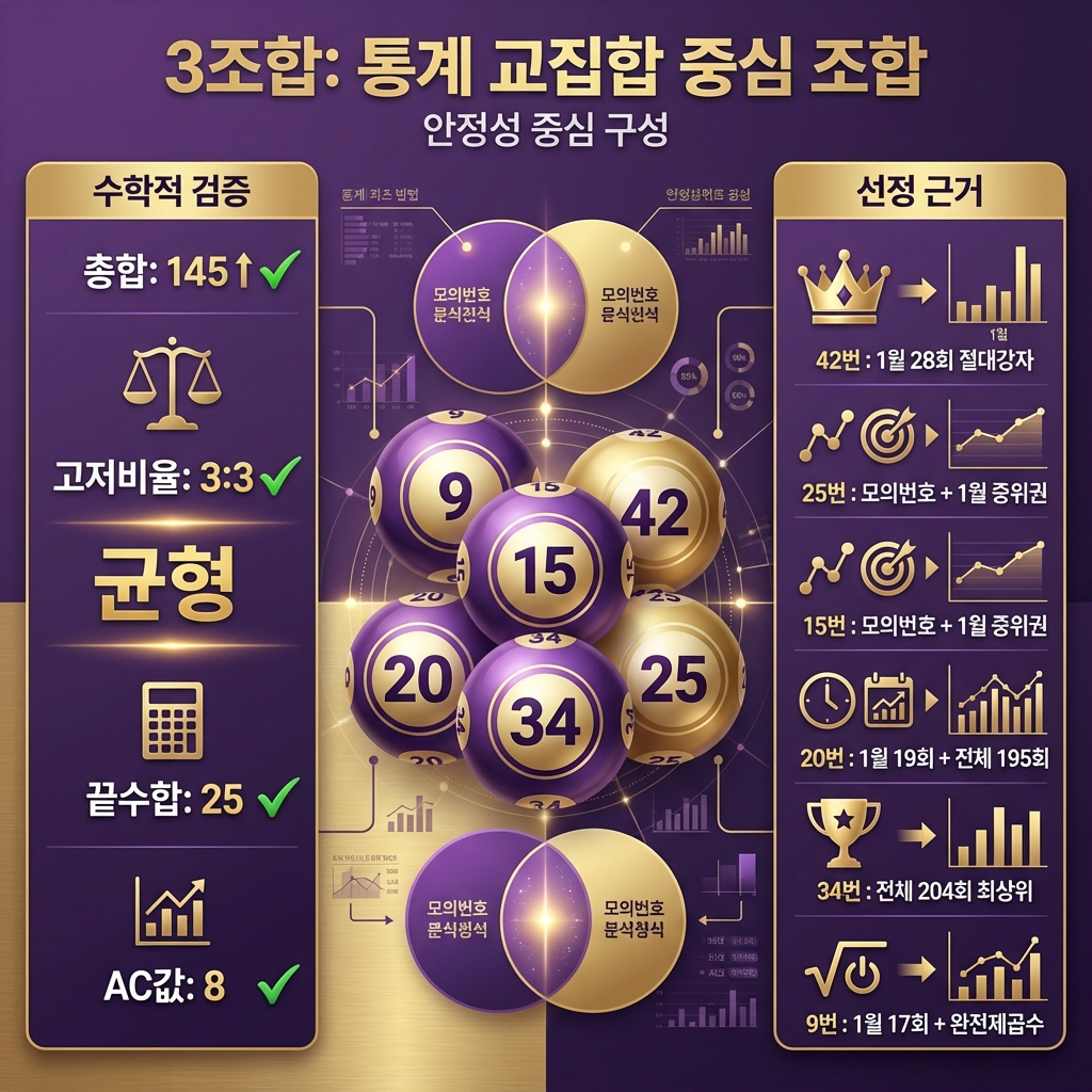 지금까지의 분석을 종합하여 통계적 근거가 명확한 3개 조합을 제시합니다. 모든 조합은 수학적 검증을 거쳤습니다.