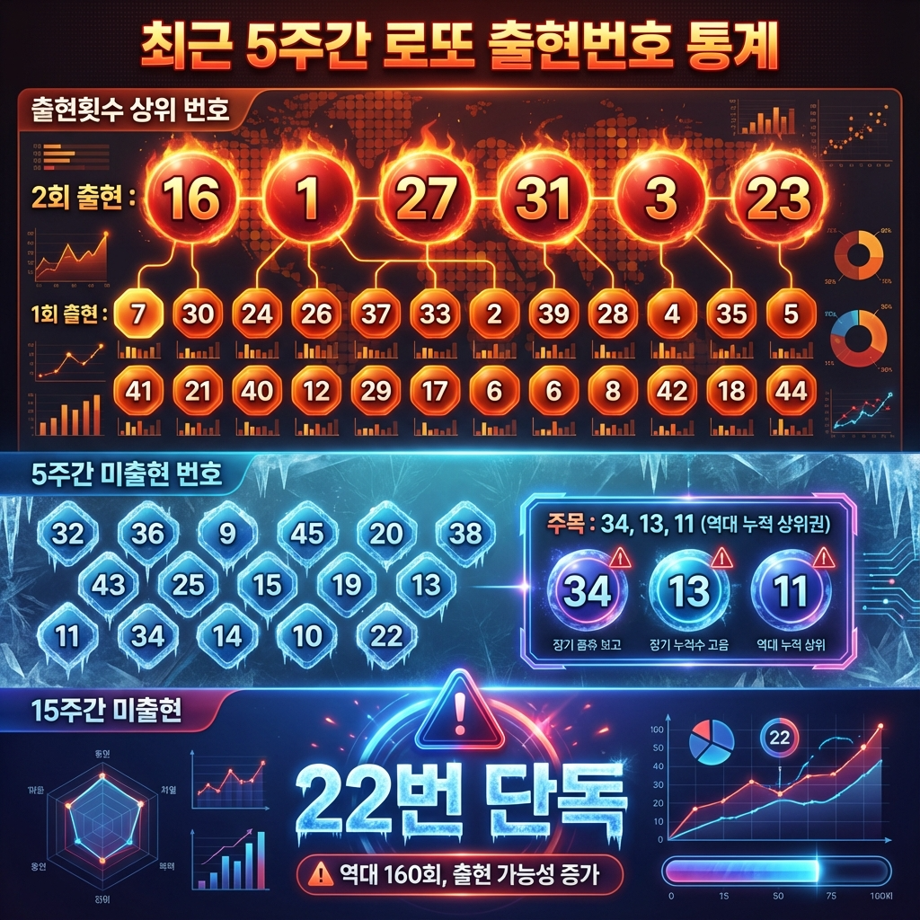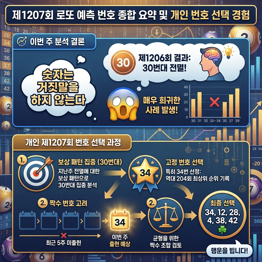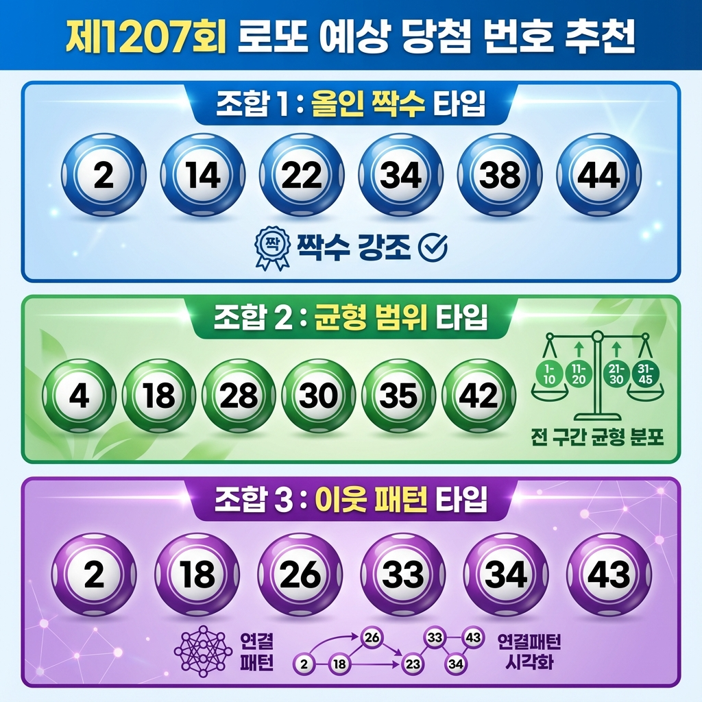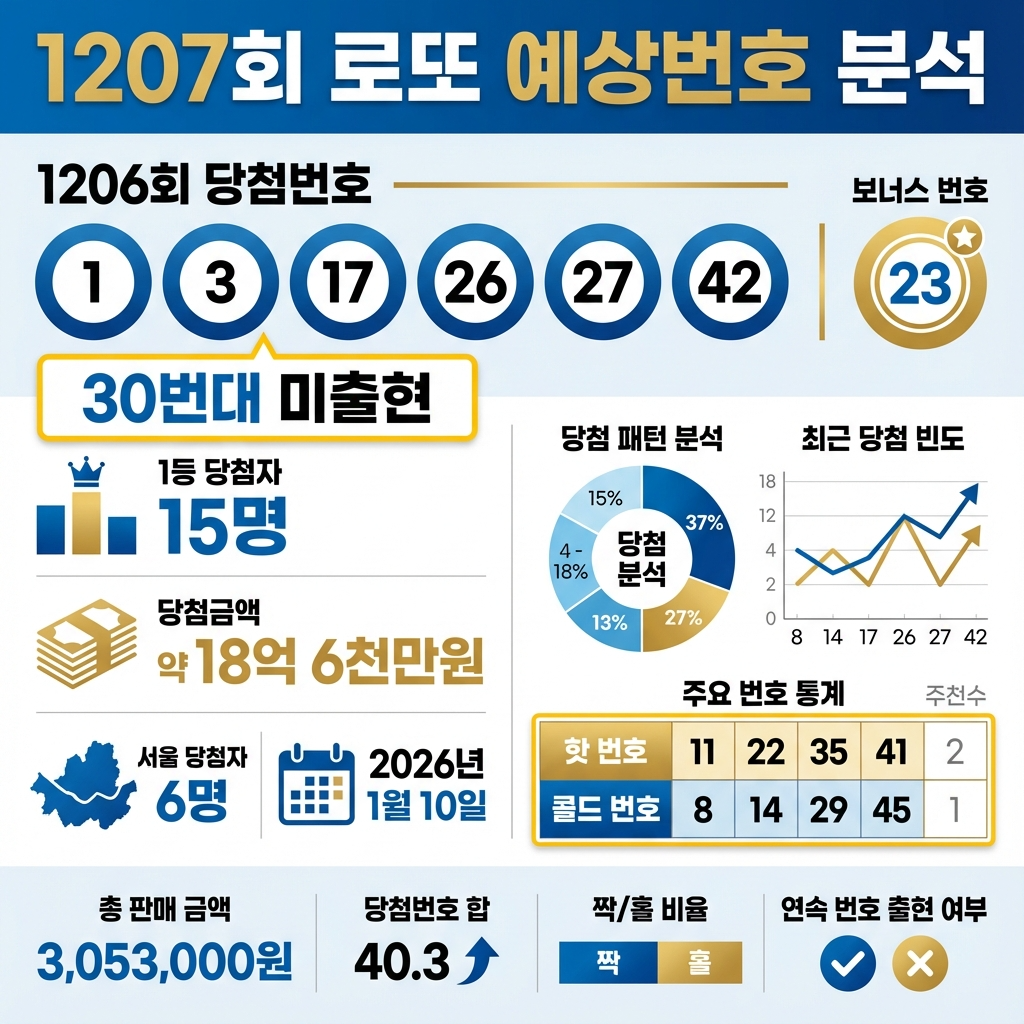 1207회 로또 예상번호를 찾고 계신가요? 오늘은 1206회 로또 추첨결과를 정밀 분석하고, 최근 5주간 출현번호와 미출현번호 통계, 1월 로또번호 역대 통계, 직전 모의번호 일치 현황까지 종합적으로 검토하겠습니다. 이를 바탕으로 1207회 로또 예상번호 3개 조합과 구체적인 번호 선정 근거를 제시해 드리겠습니다.