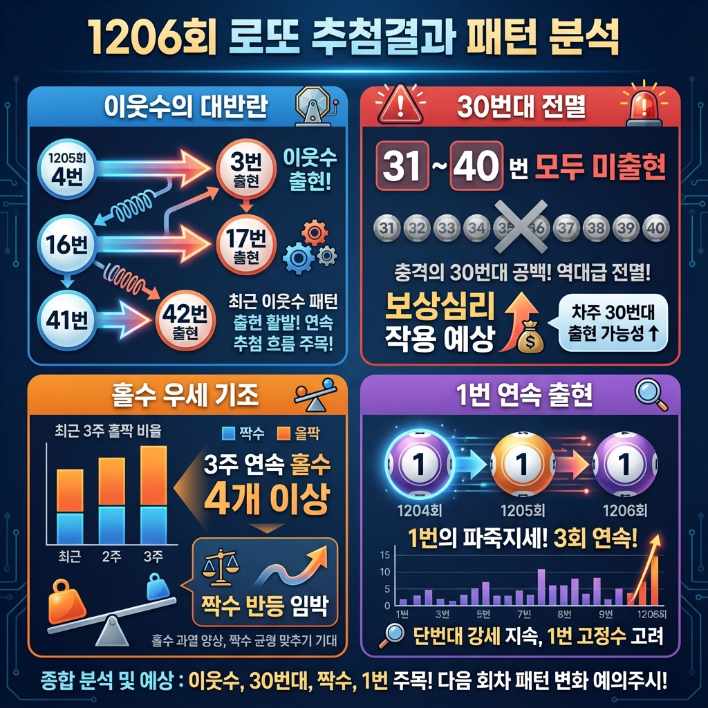 지난 1206회 로또 당첨번호에서 30번대가 단 하나도 나오지 않은 이례적인 결과가 나왔습니다. 이번주 1207회 로또 당첨번호 예측에 이 패턴이 어떤 영향을 미칠지, 많은 분들이 궁금해하실 것입니다.