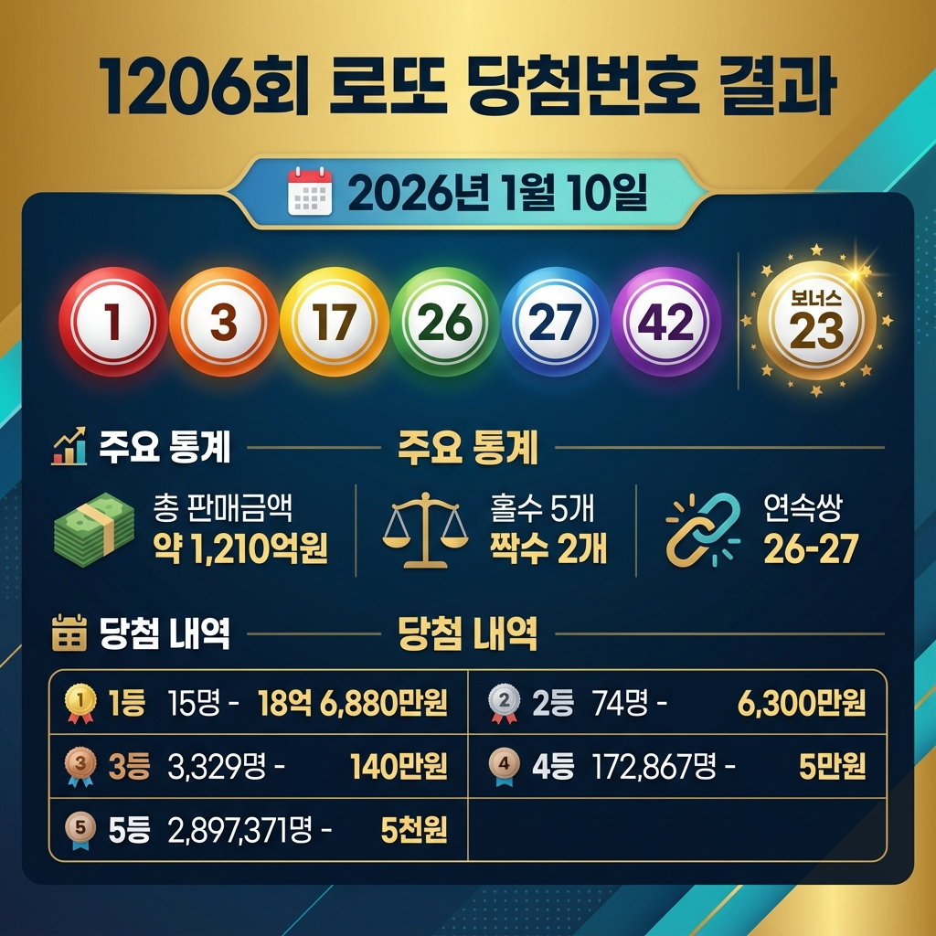 2026년 1월 10일 추첨된 1206회 로또 당첨번호는 1, 3, 17, 26, 27, 42이며 보너스 번호는 23이었습니다. 1등 당첨자 15명이 각각 약 18억 6천만원을 수령하게 되었고, 서울에서만 6명의 당첨자가 나왔습니다.