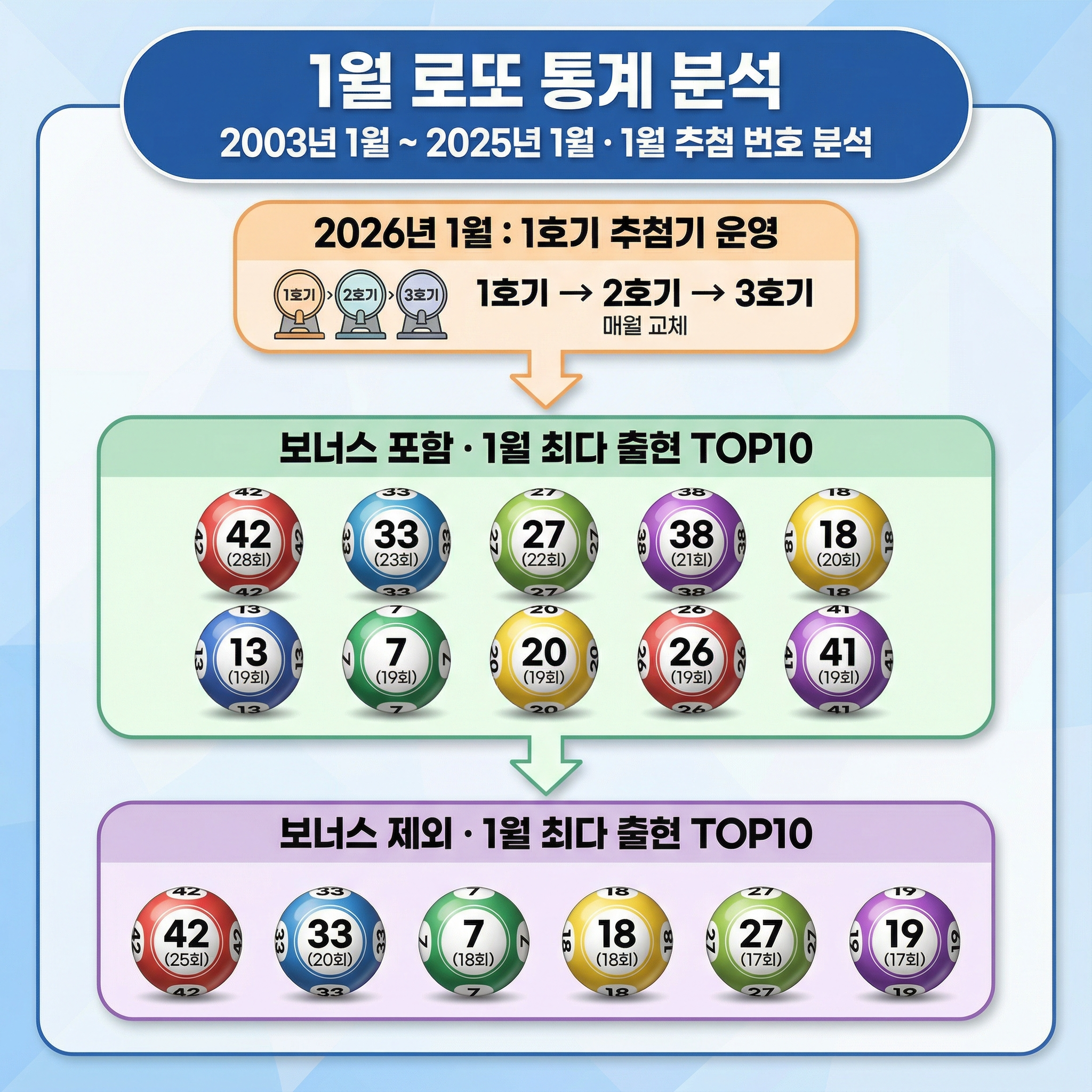 1월 역대 통계에서는 42번이 28회로 가장 많이 나왔고, 33번(23회), 27번(22회), 38번(21회)이 뒤를 이었습니다. 반면 23번(7회)은 1월에 가장 적게 나온 번호입니다.