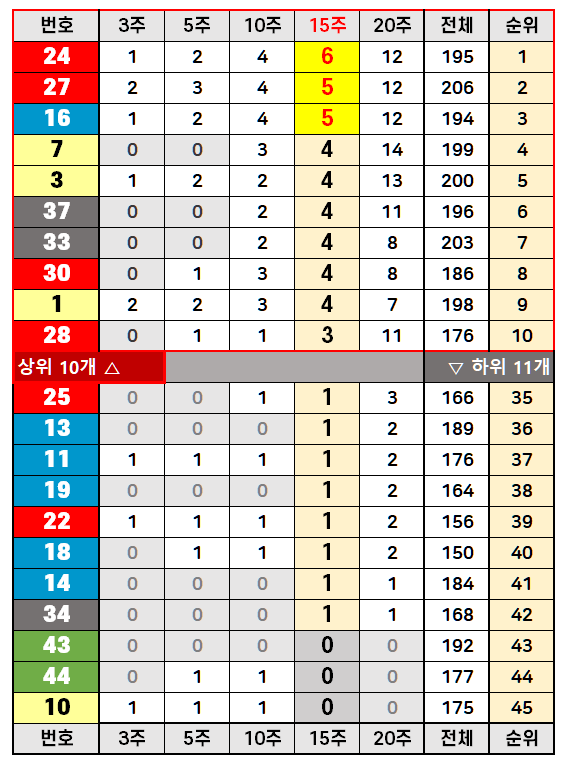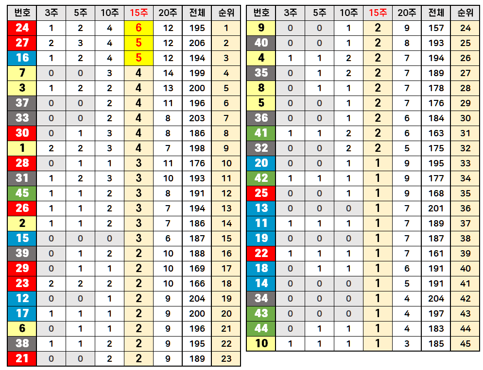 15주간 출현횟수 기준으로 정렬한 45개 번호 내역입니다. 분석하는데 참고하세요.