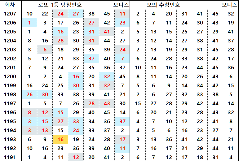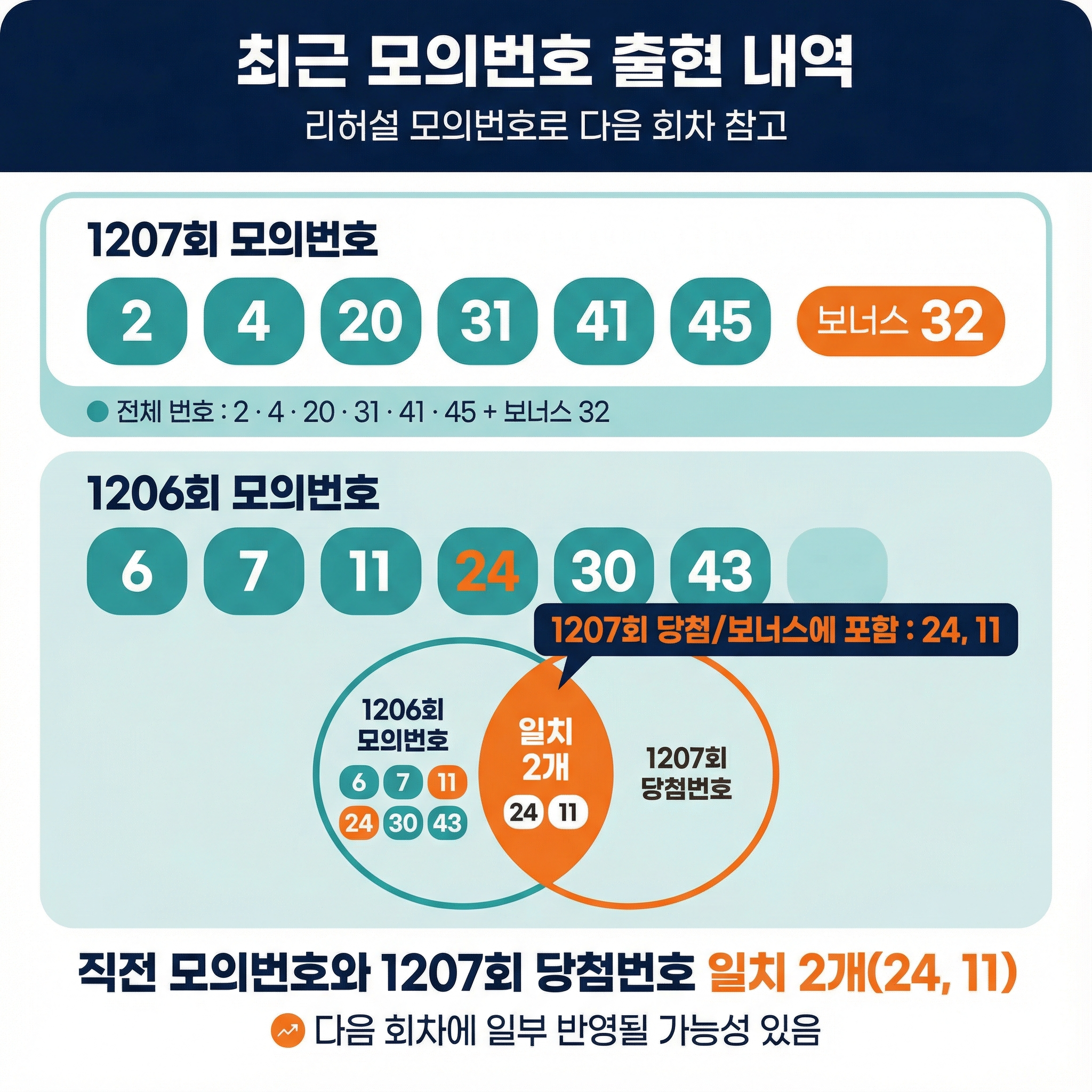 최근 패턴을 분석하면, 1207회 당첨번호 중 직전 1206회 모의번호와 일치하는 숫자가 2개(24번, 11번)였습니다. 이는 직전 모의번호가 다음 회차에 영향을 줄 수 있다는 분석을 뒷받침합니다.