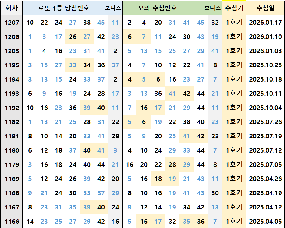 최근 5회차 내에서 연속쌍이 나온 사례를 보면, 1207회(10-11), 1200회(1-2) 등이 있습니다. 연속번호는 무작위 추첨에서도 일정 빈도로 나타나는 자연스러운 현상입니다.