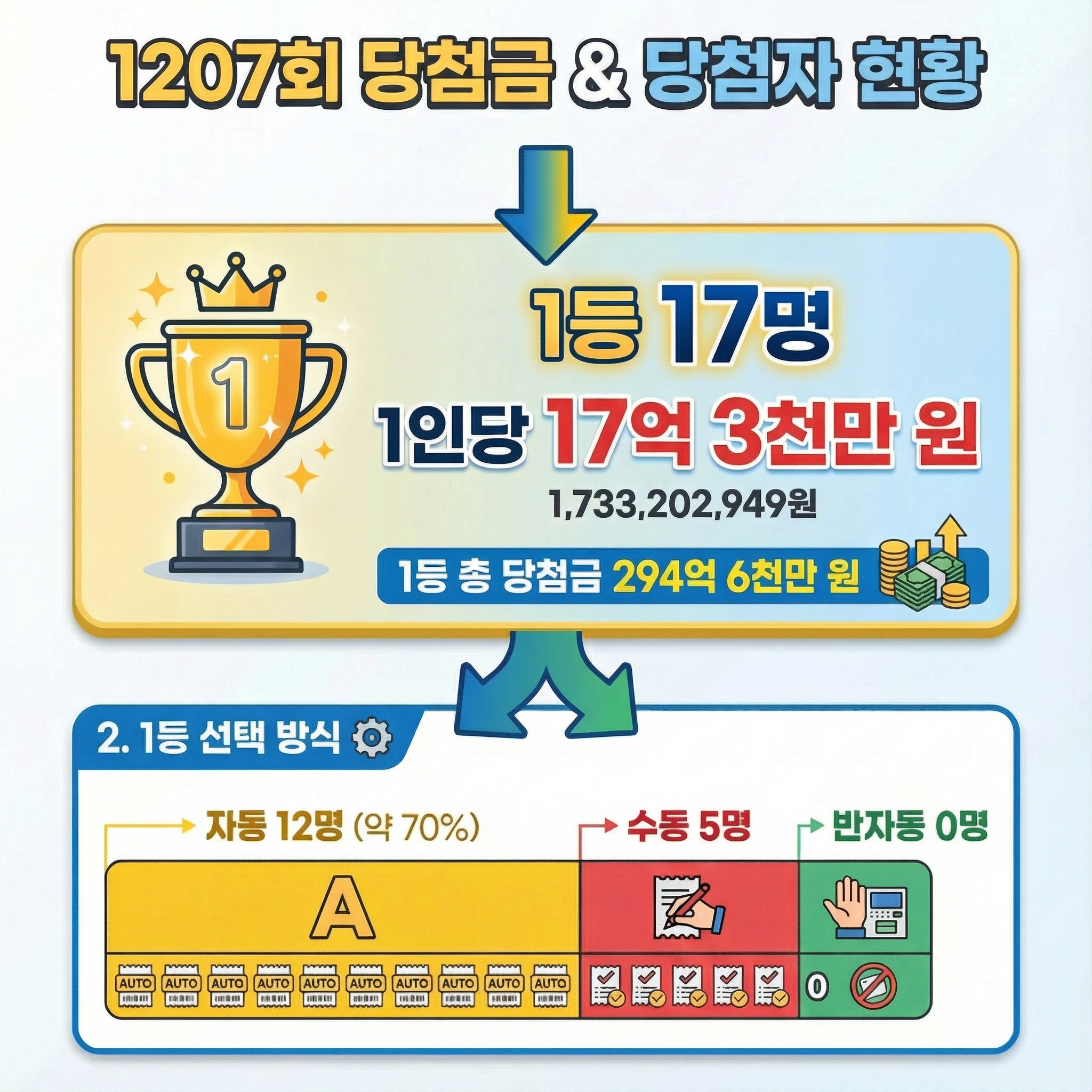 1207회에서는 10, 22, 24, 27, 38, 45 + 보너스 11이 당첨되었으며, 17명의 1등 당첨자가 1인당 약 17억 3천만 원을 받게 되었습니다. 자동 12명, 수동 5명으로 자동 방식 당첨자가 더 많았습니다.