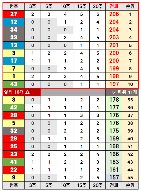 27번(206회), 12번(204회), 34번(204회), 33번(203회), 13번(201회), 3번(200회), 17번(200회), 7번(199회), 1번(198회), 43번(197회), 37번(196회), 6번(196회), 24번(195회), 38번(195회), 20번(195회) 순입니다.