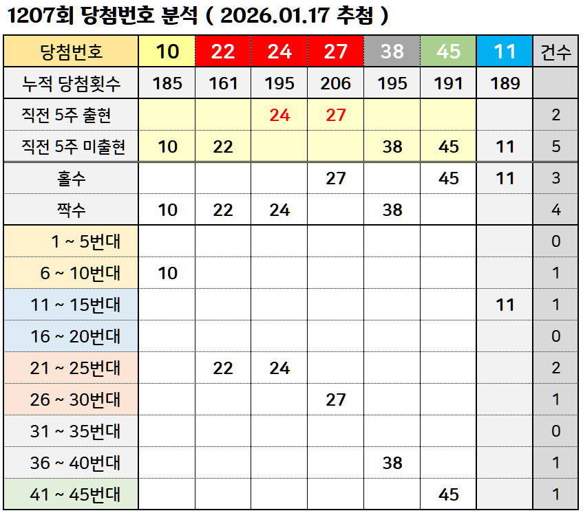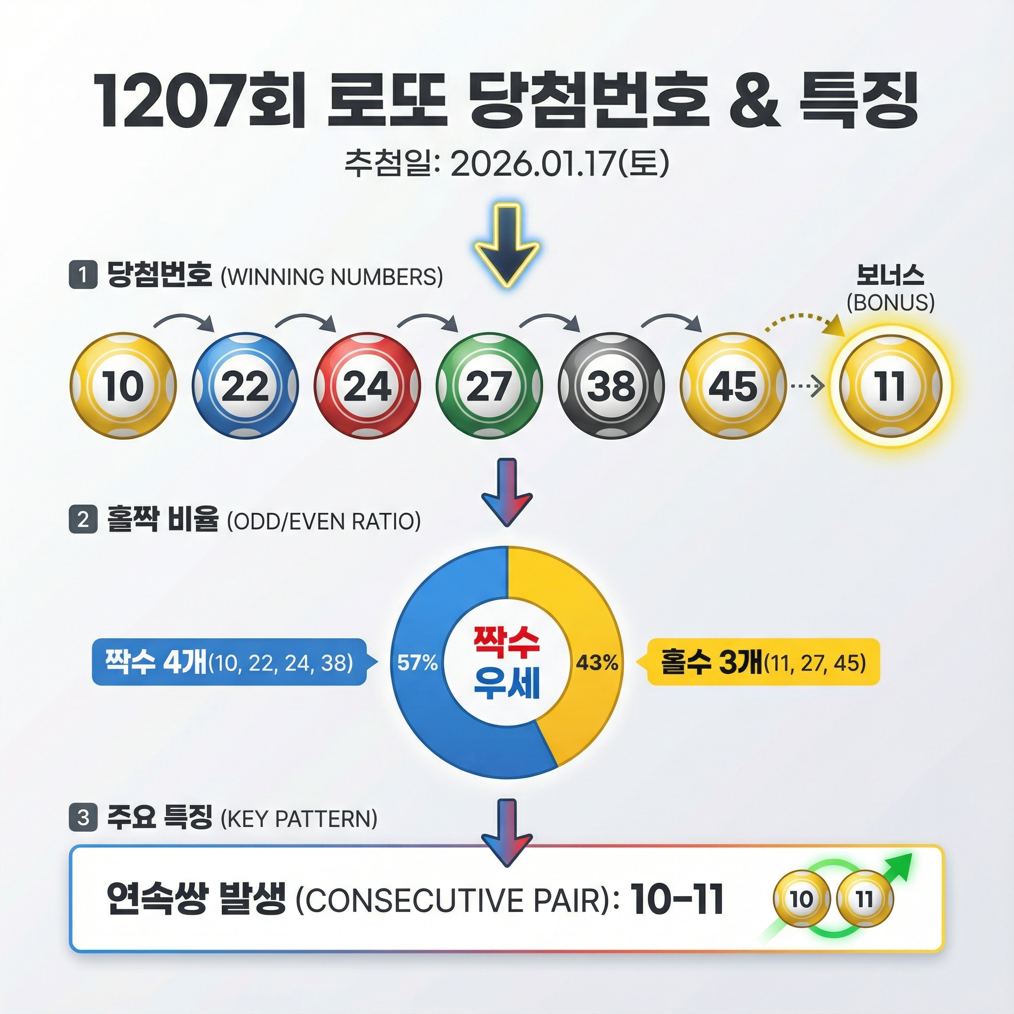 2026년 1월 17일 토요일에 추첨된 1207회 로또 1등 당첨번호는 10, 22, 24, 27, 38, 45이며, 보너스 번호는 11입니다.