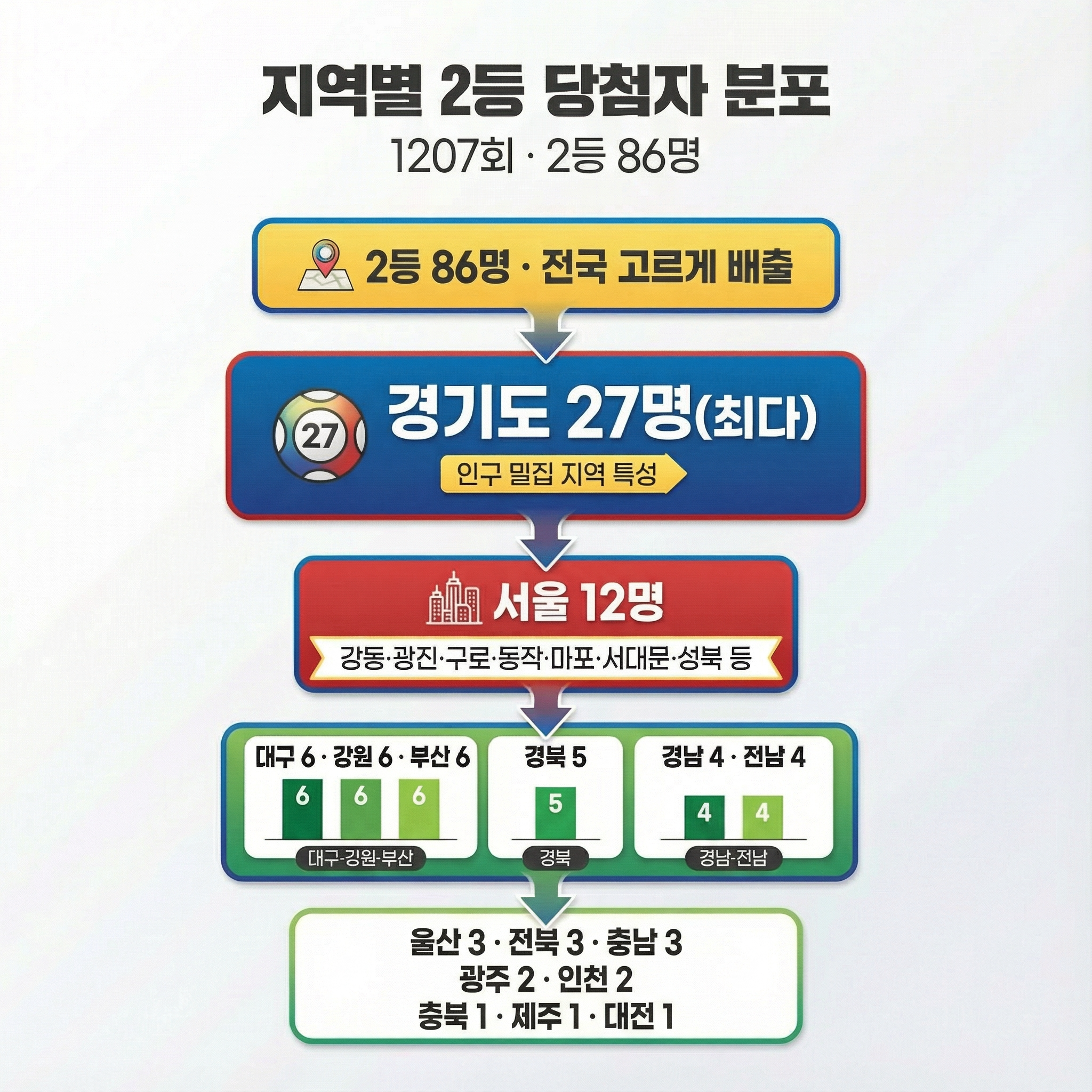 1207회 로또 2등 당첨자는 총 86명으로, 전국 각지에서 고르게 배출되었습니다.