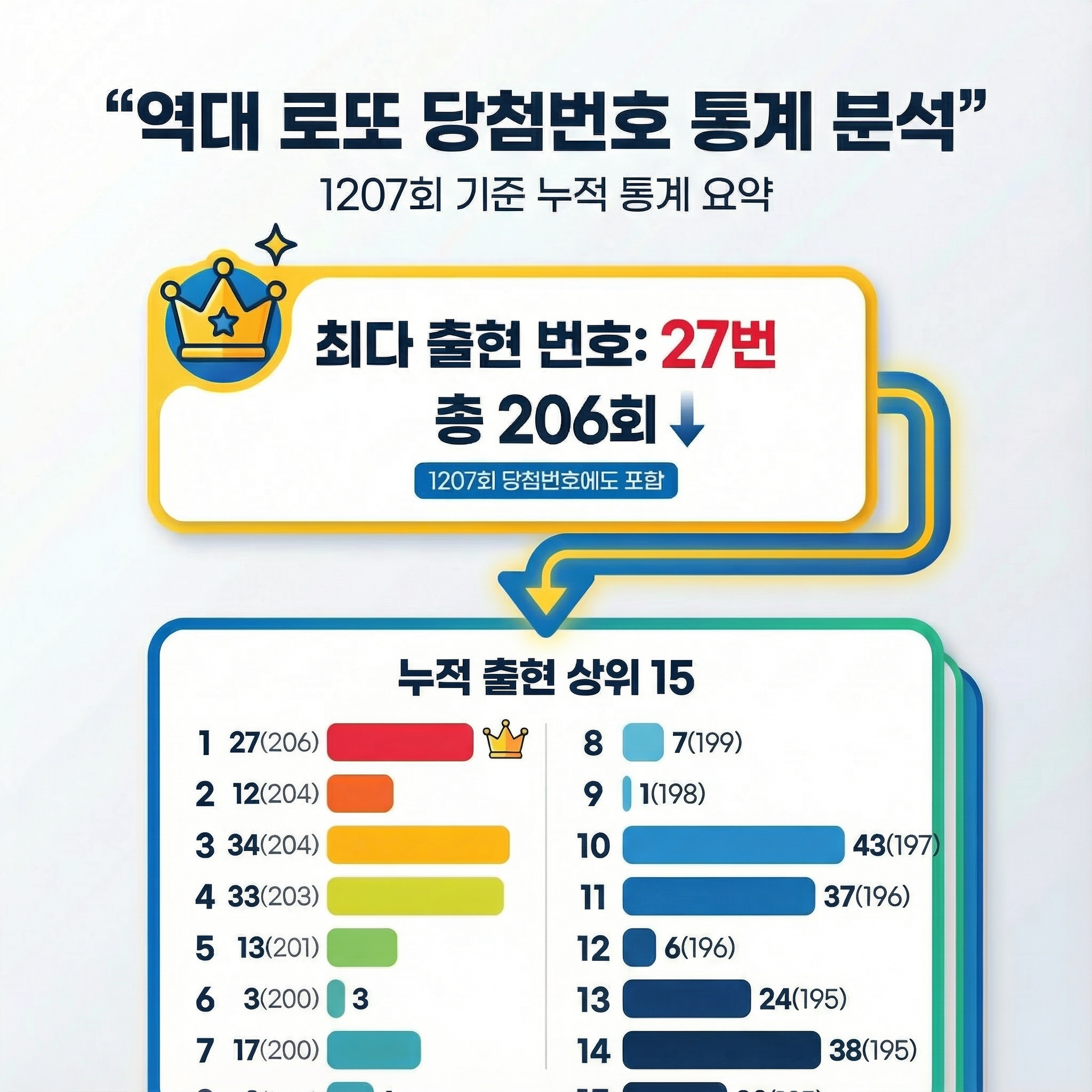 1207회 기준 역대 누적 통계를 살펴보면, 가장 많이 나온 번호는 27번으로 총 206회 출현했습니다. 27번은 이번 1207회에도 당첨번호에 포함되면서 최다 출현 기록을 이어가고 있습니다.
