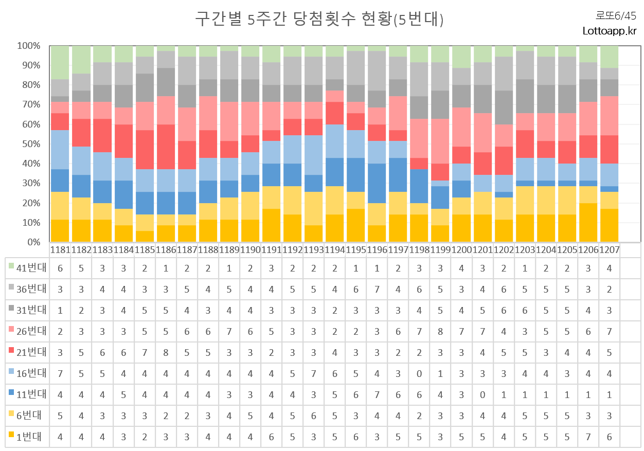 종합하면 최근 5주간 21번대에서 가장 많이 나왔고, 11번대와 31번대에서 상대적으로 적게 나왔습니다.