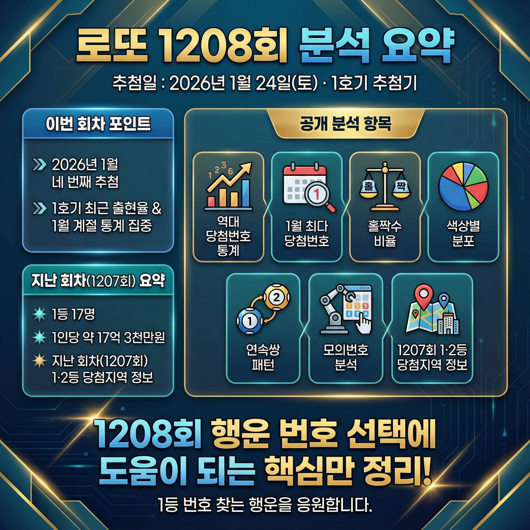2026년 1월 24일 토요일, 로또 1208회 당첨번호 추첨일이 다가왔습니다. 로또 당첨 예상번호 찾고 계신가요? 2026년 1월 네 번째 로또번호 추첨으로, 1호기 추첨기가 사용됩니다. 지난 1207회 로또 1등 2등 당첨지역 정보부터 역대 당첨번호 통계, 1월 최다 당첨번호, 홀짝수 비율, 색상별 분포, 연속쌍 패턴, 모의번호 분석까지 모든 것을 공개합니다. 1호기 추첨기에서 최근 높은 출현율을 보인 번호들과 1월 계절 통계를 집중 분석했습니다.