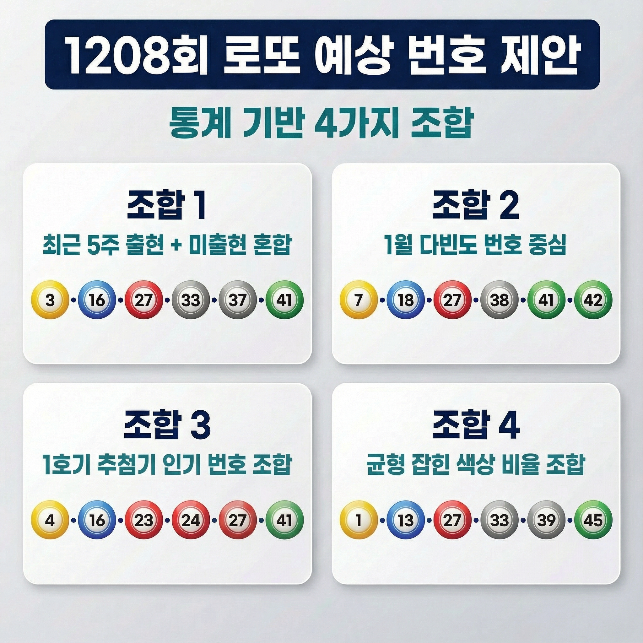 이번 섹션에서는 앞서 분석한 통계 데이터를 바탕으로 1208회 로또 예상번호 조합을 제시합니다.