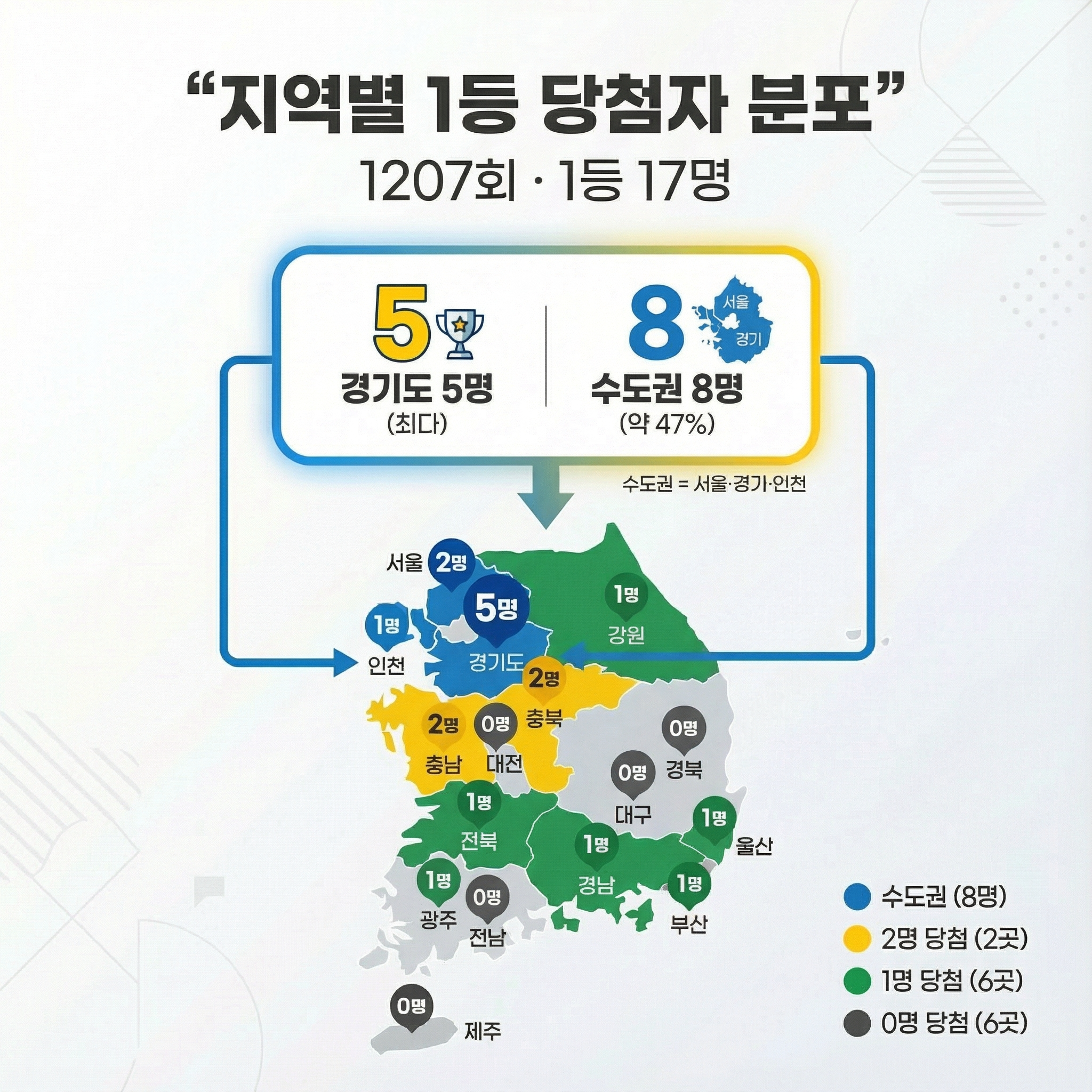 1207회 로또 1등 당첨자 17명의 지역별 분포를 분석해 보면, 경기도가 5명으로 가장 많은 당첨자를 배출했습니다. 경기도 내에서는 고양시, 동두천시, 안산시, 의정부시, 평택시에서 각 1명씩 당첨자가 나왔습니다.