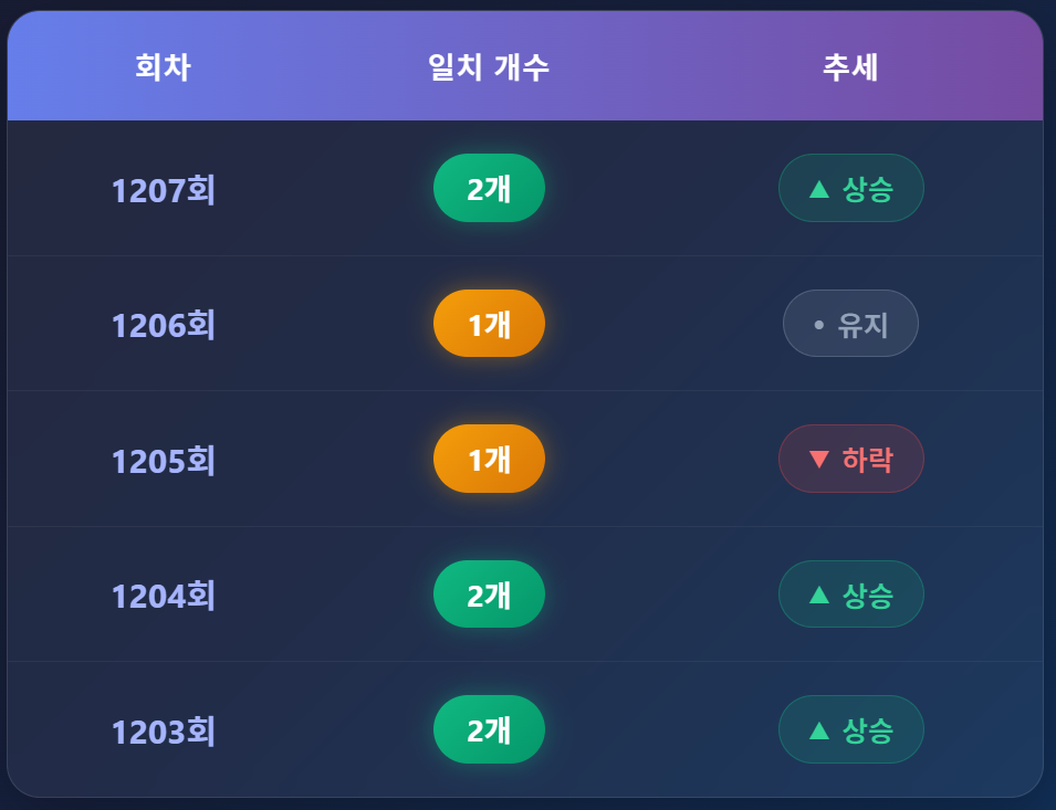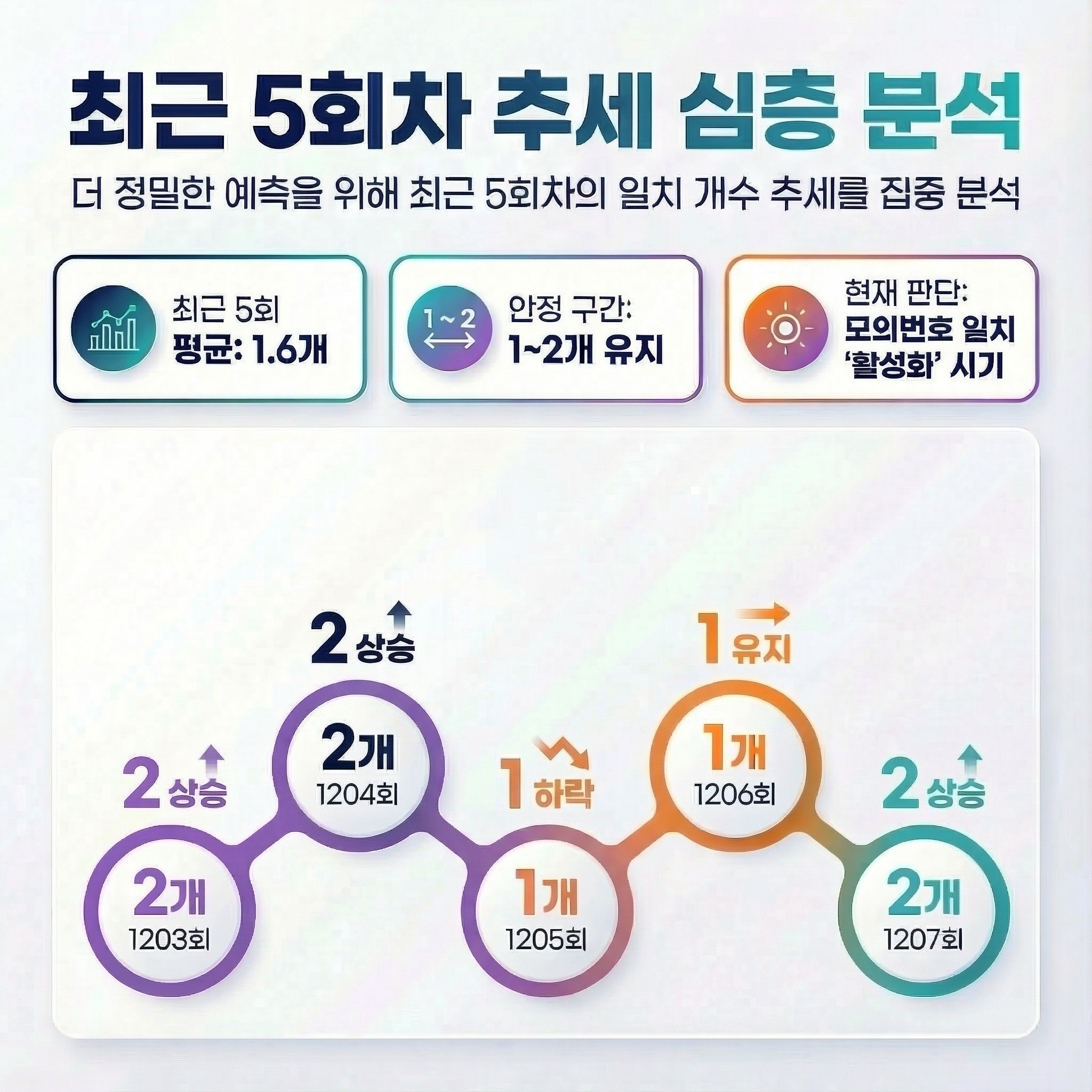 최근 5회차 평균 일치 개수는 1.6개이며, 1203회부터 1207회까지의 흐름을 보면 2개→2개→1개→1개→2개로 일치 개수가 1~2개 사이에서 안정적으로 유지되고 있습니다.