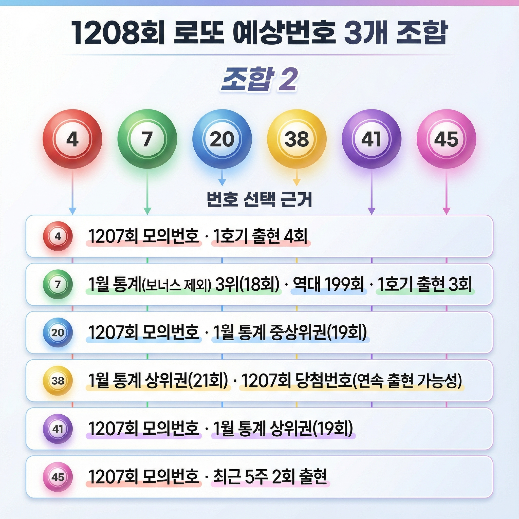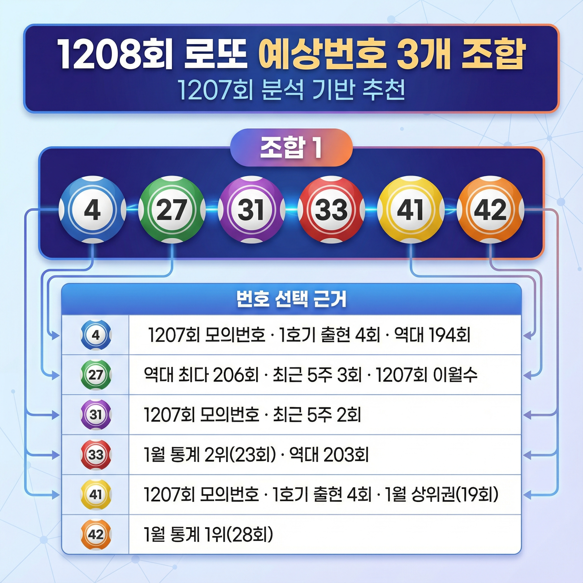 위 분석을 바탕으로 1208회 로또 예상번호 3개 조합을 제시합니다.