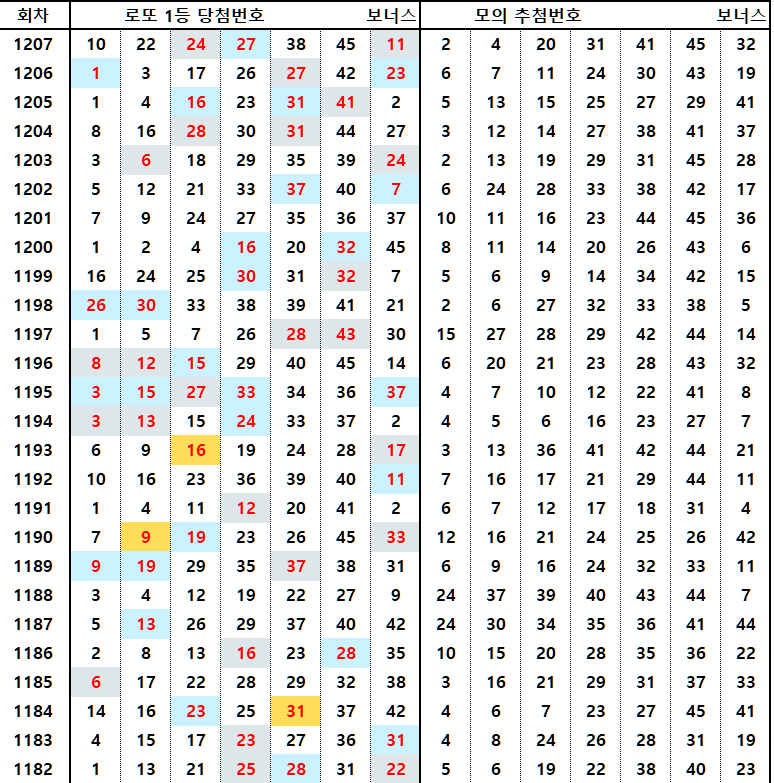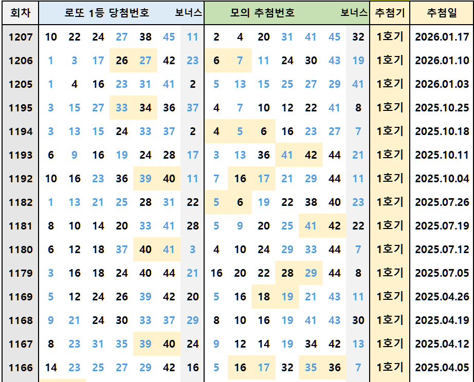 이번 글에서는 지난 1207회 로또당첨번호와 직전 회차 모의번호의 일치 패턴을 과거 데이터로 재귀 분석하여, 1208회 로또 예상번호를 도출해보겠습니다.