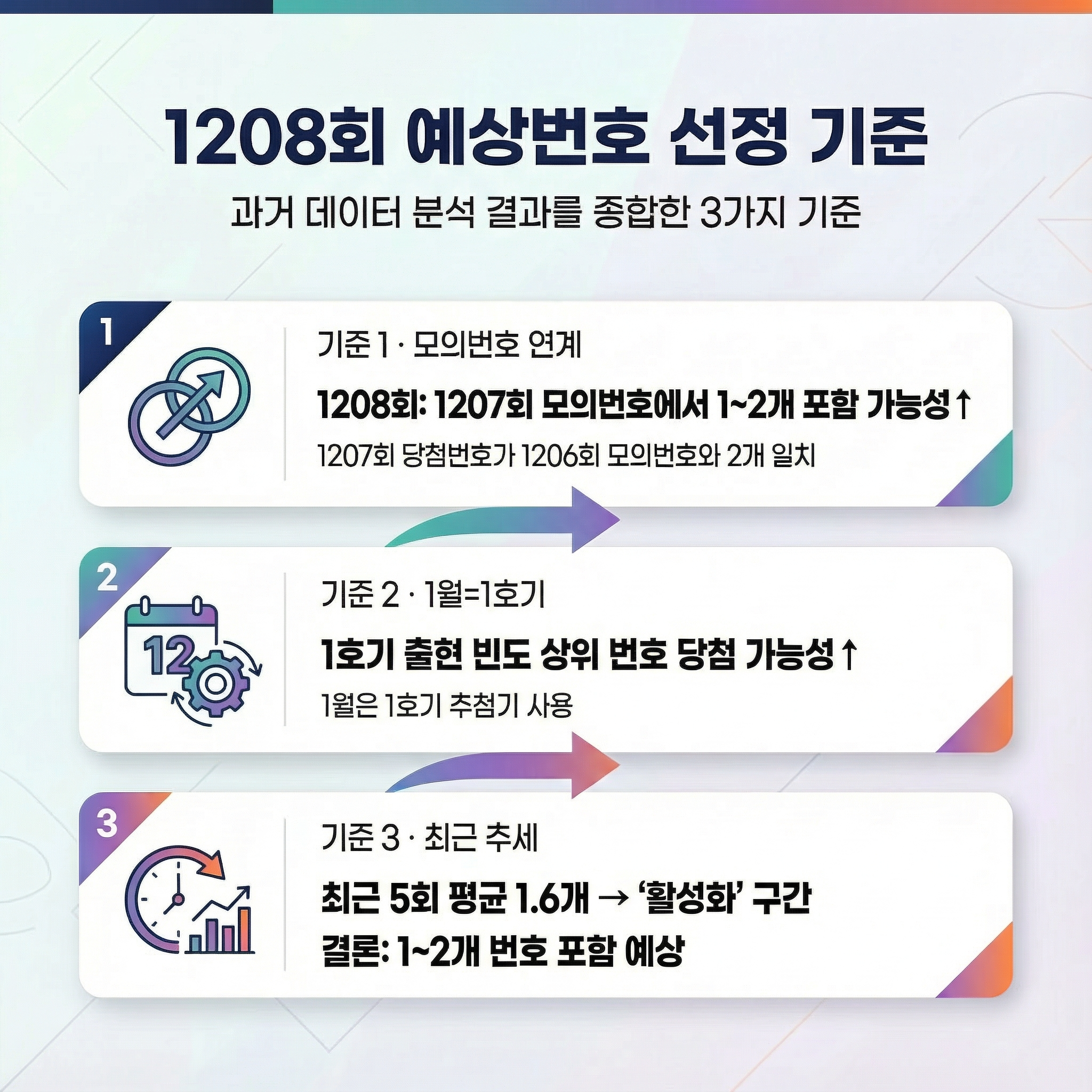첫째, 1207회 당첨번호가 직전 1206회 모의번호와 2개 일치했으므로, 1208회 당첨번호도 1207회 모의번호에서 1~2개가 포함될 가능성이 높습니다.
