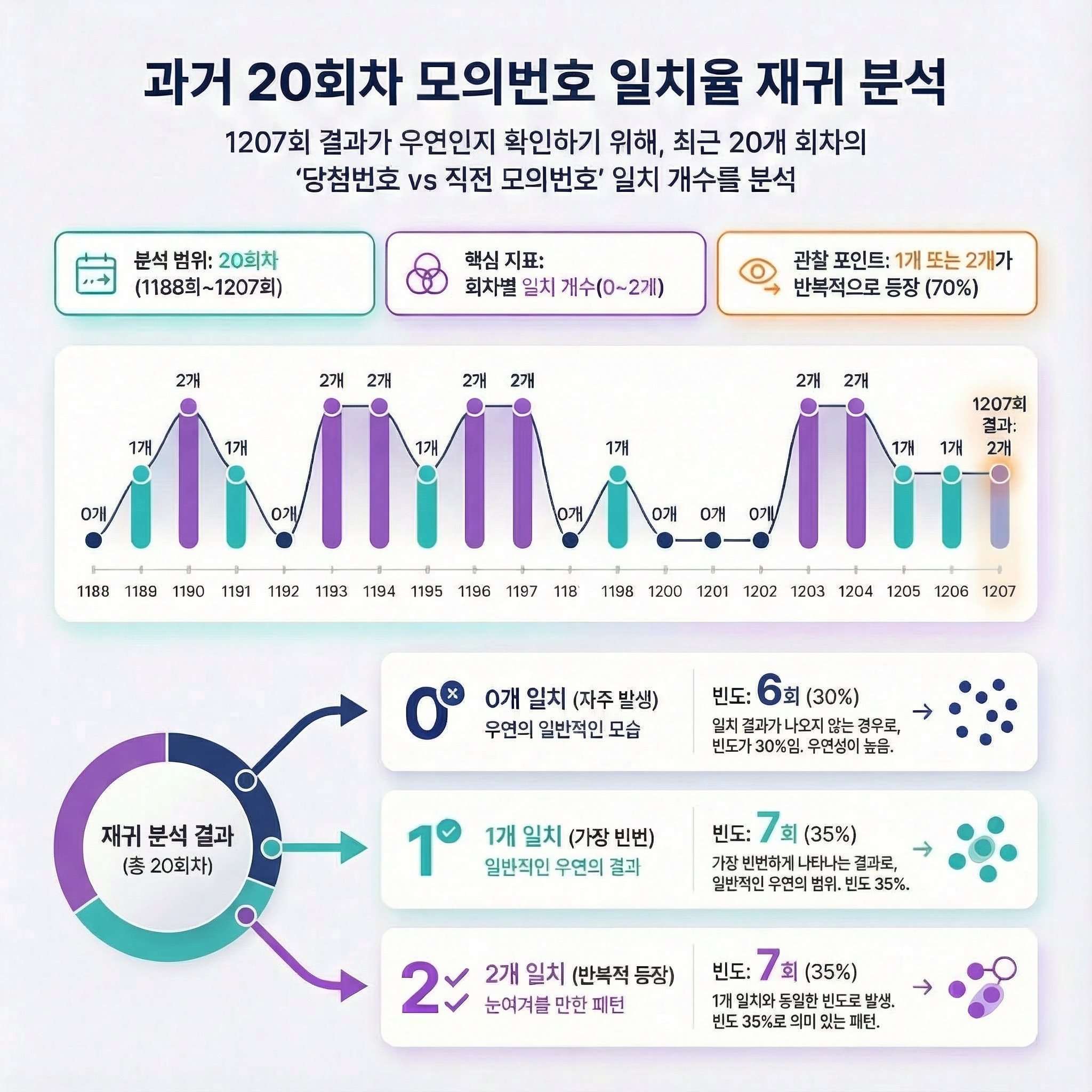 1207회만의 결과가 우연인지, 아니면 지속적인 패턴인지 확인하기 위해 과거 20개 회차의 당첨번호와 직전 모의번호 일치 현황을 재귀적으로 분석했습니다.