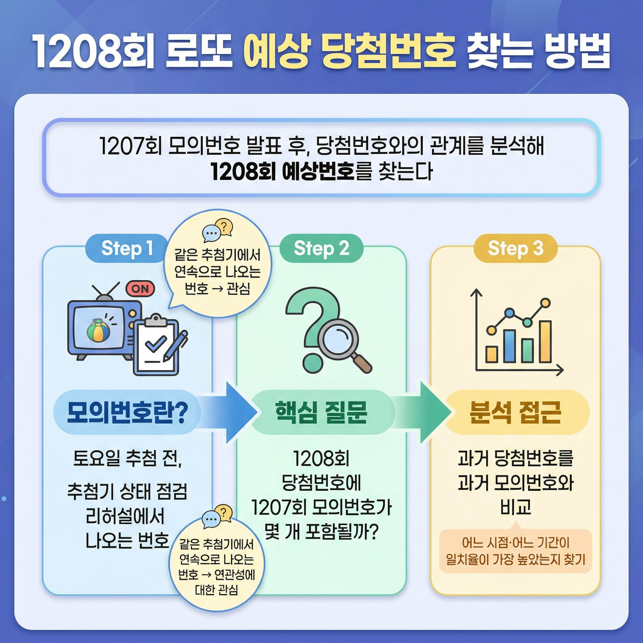 1207회 모의번호 발표되었는데, 로또 당첨번호와 모의번호의 관계를 분석하여 이번주 1208회 로또 예상번호를 찾아 보려고 합니다. 1208회 당첨번호는 직전 1207회 모의번호에서 몇 개 포함될까요? 1207회 당첨번호를 과거 모의번호와 비교했을 때, 어느 시점 어느 기간이 일치율 가장 높은지 분석하여 1208회 로또 당첨번호를 예측하고자 합니다.