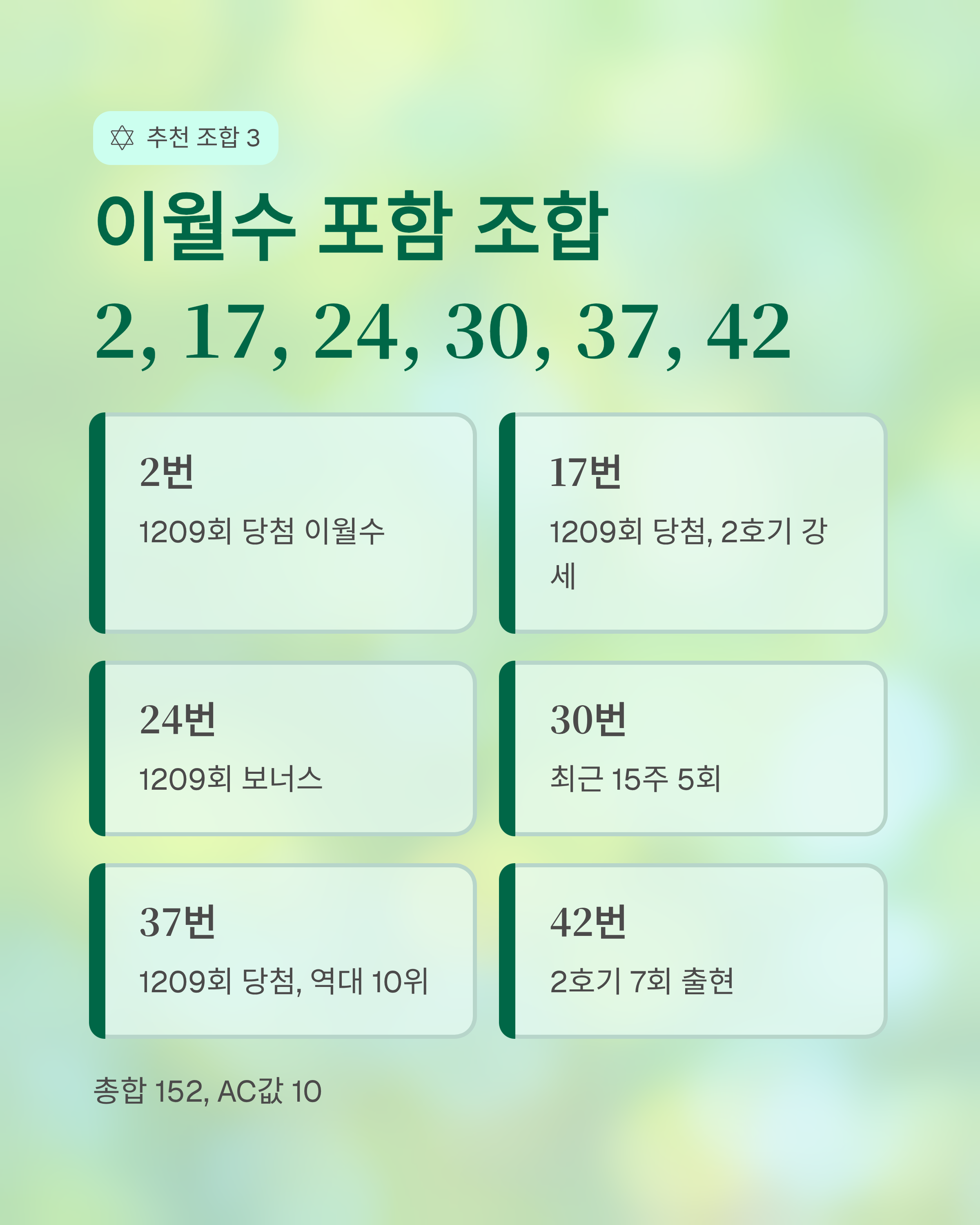 - 2번: 1209회 당첨번호, 이월수로 연속 출현 가능성 고려