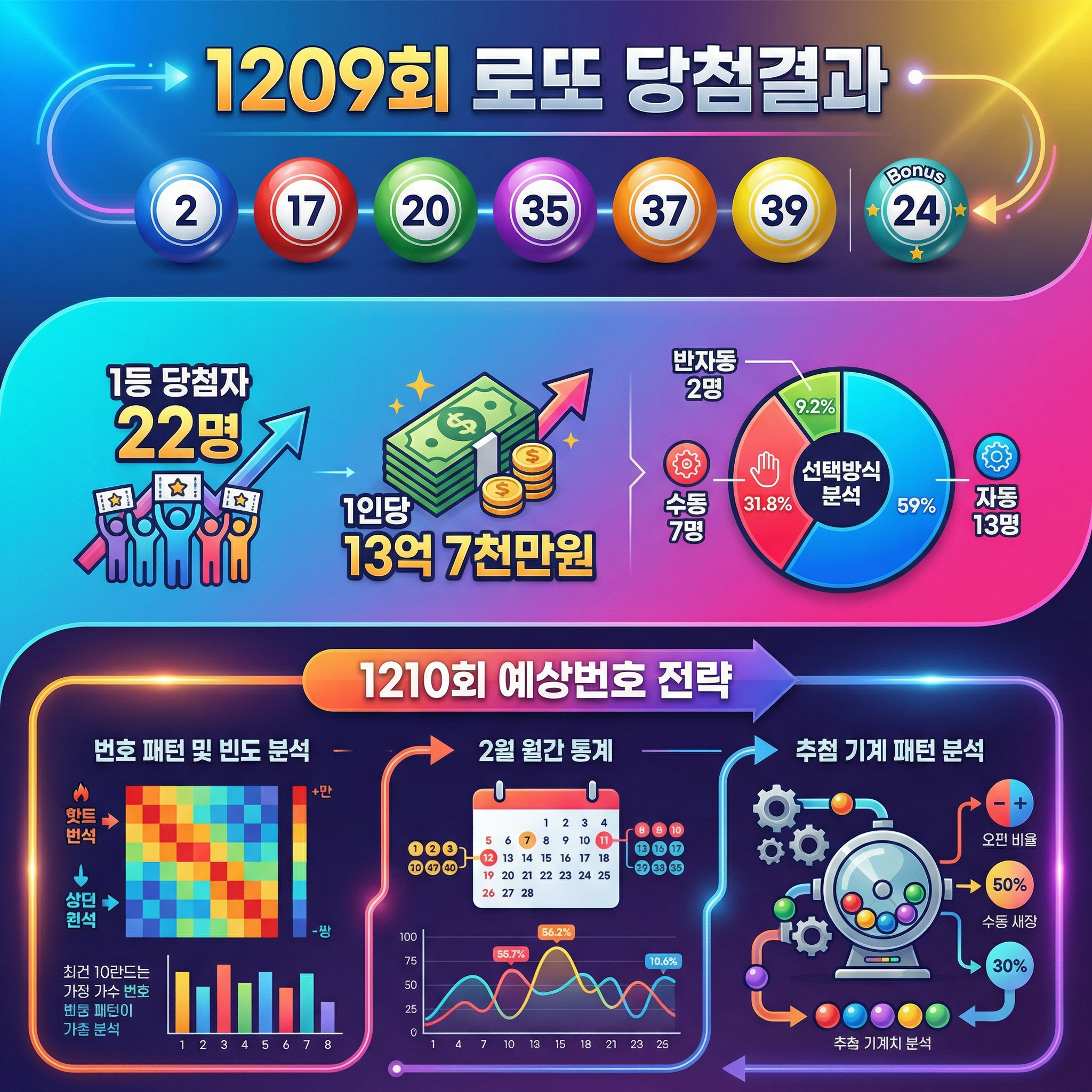 1209회 로또 당첨번호는 2, 17, 20, 35, 37, 39이며 보너스 번호는 24였습니다. 이번 추첨에서는 22명의 1등 당첨자가 탄생했고, 1인당 약 13억 7천만 원의 당첨금이 지급되었습니다. 흥미로운 점은 자동 13명, 수동 7명, 반자동 2명으로 수동 선택 비율이 평소보다 높았다는 것입니다.