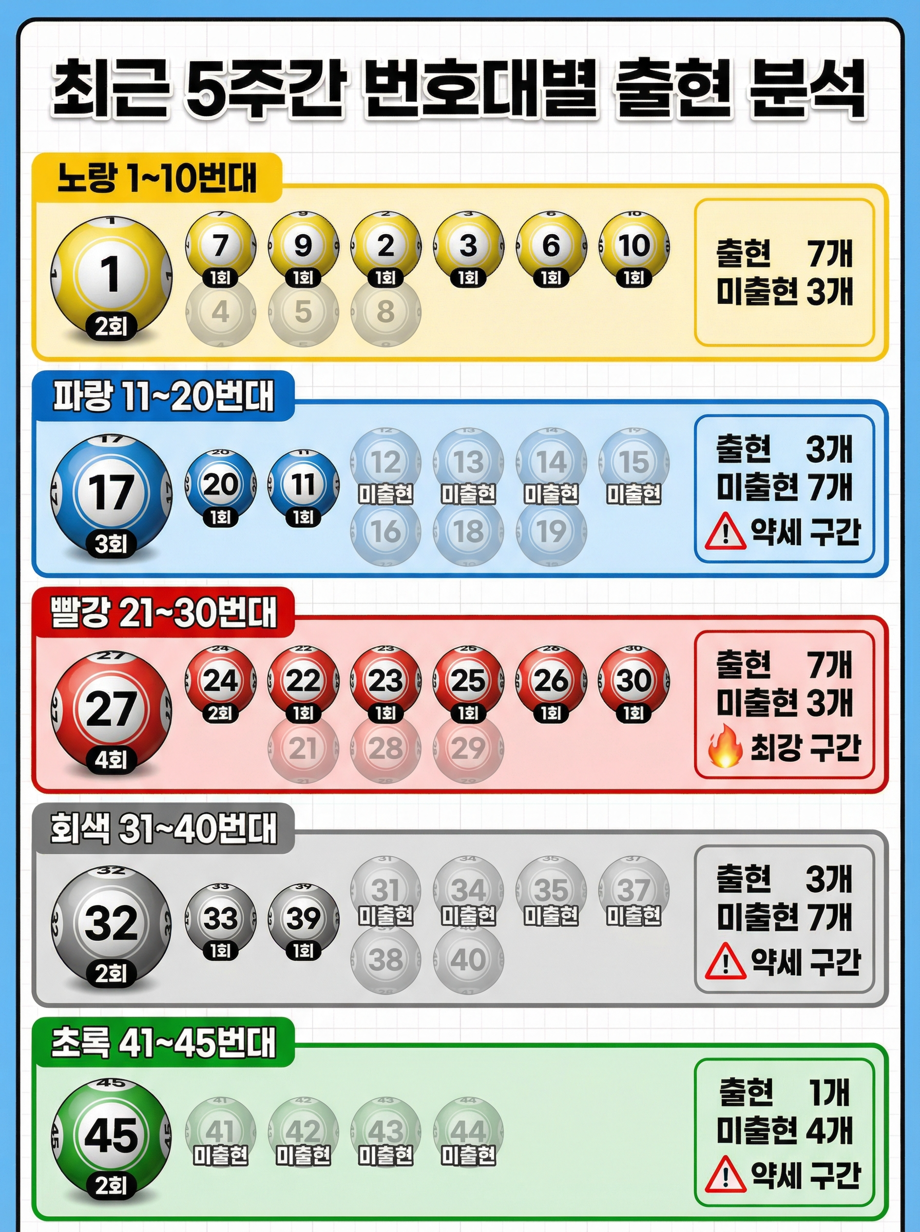 최근 5주간 출현 번호를 번호대별로 상세히 정리하면 다음과 같습니다.