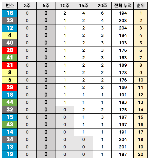 파랑색 11~20번대 출현번호 : 17(3회), 20(1회), 11(1회) — 3개 번호만 출현하여 이 구간의 약세가 뚜렷합니다. 미출현 번호가 12, 13, 14, 15, 16, 18, 19번으로 7개나 됩니다.