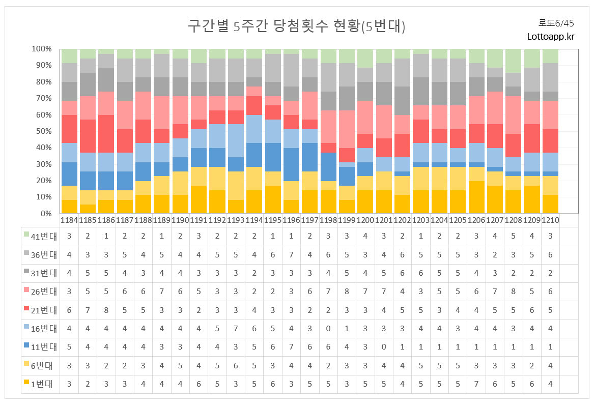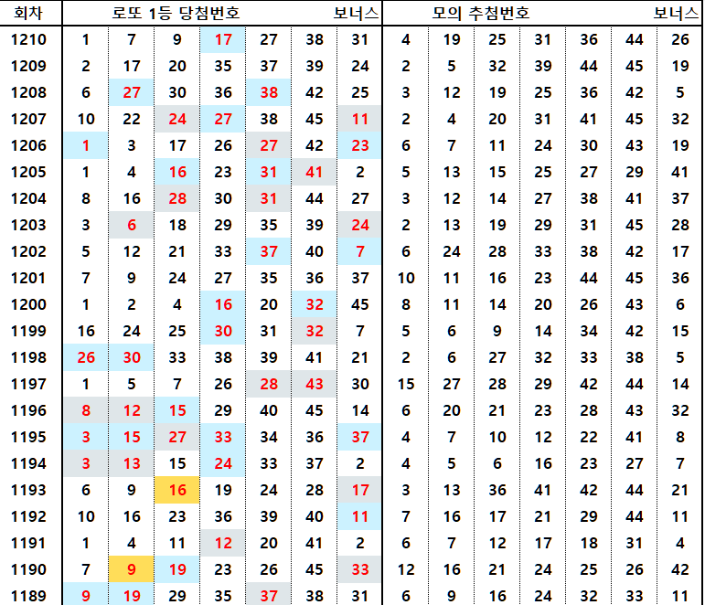 최근 데이터에서도 1210회는 5개 일치, 1208회는 5개 일치, 1205회는 5개 일치를 보여주었기에, 1211회도 5주간 출현번호에서 4개 이상 일치될 것으로 전망됩니다.