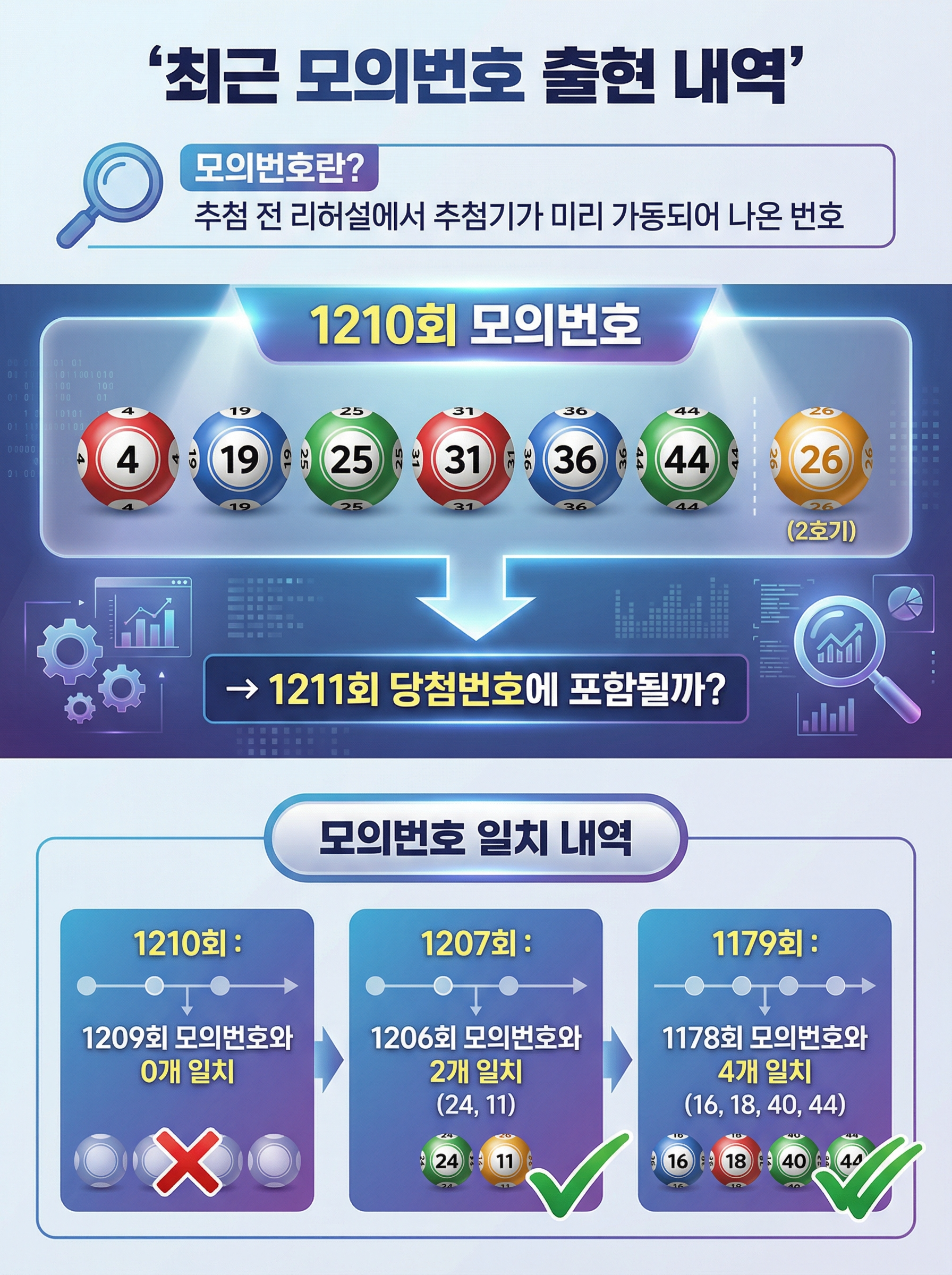 1210회 모의번호는 4, 19, 25, 31, 36, 44 + 26(2호기)이었습니다. 이 모의번호가 1211회 당첨번호에 포함될 수 있는지가 핵심 관심사입니다.