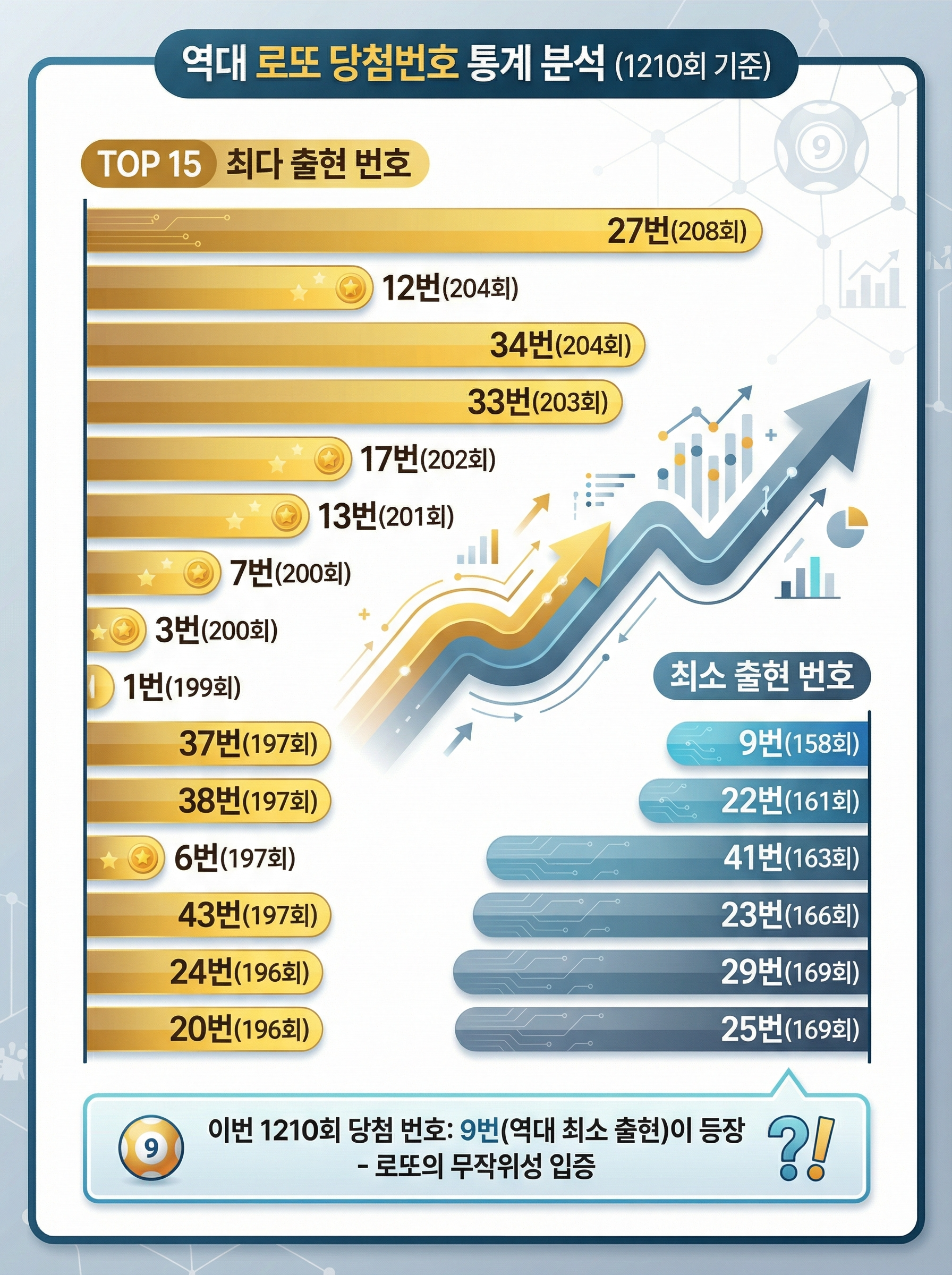 반대로 가장 적게 나온 번호는 9번으로 총 158회에 그치고 있습니다. 하위권 번호로는 22번(161회), 41번(163회), 23번(166회), 29번(169회), 25번(169회) 등이 있습니다. 흥미로운 점은 이번 1210회에서 9번이 당첨되었다는 것인데, 역대 최소 출현 번호가 등장했다는 것은 로또의 무작위성을 다시 한번 보여주는 사례입니다.