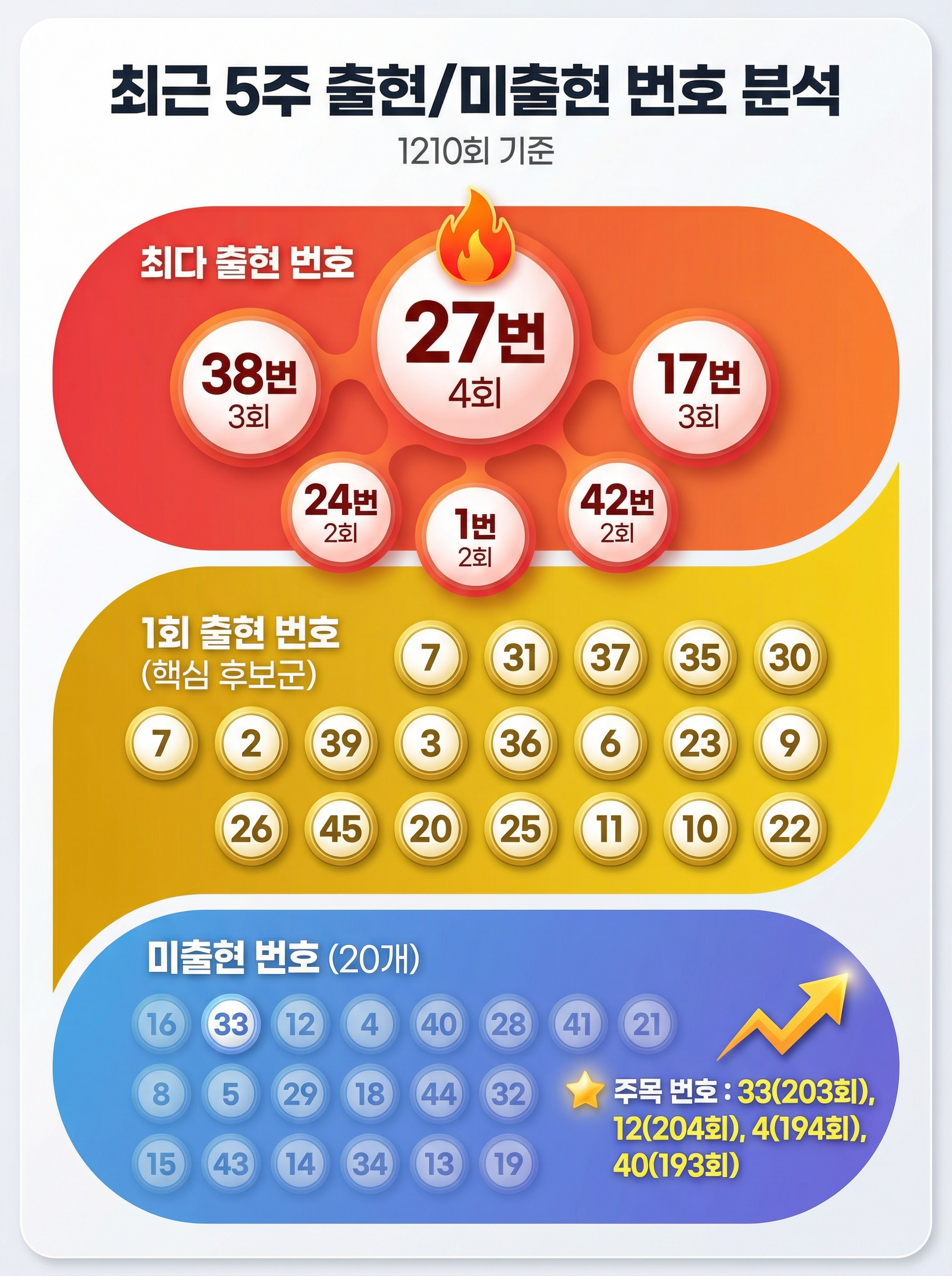 1210회 기준 최근 5주간 당첨횟수를 분석하면, 27번이 4회로 단독 최다 출현을 기록했습니다. 38번과 17번이 각 3회로 그 뒤를 따르고 있으며, 24번, 1번, 42번이 각 2회 출현했습니다.