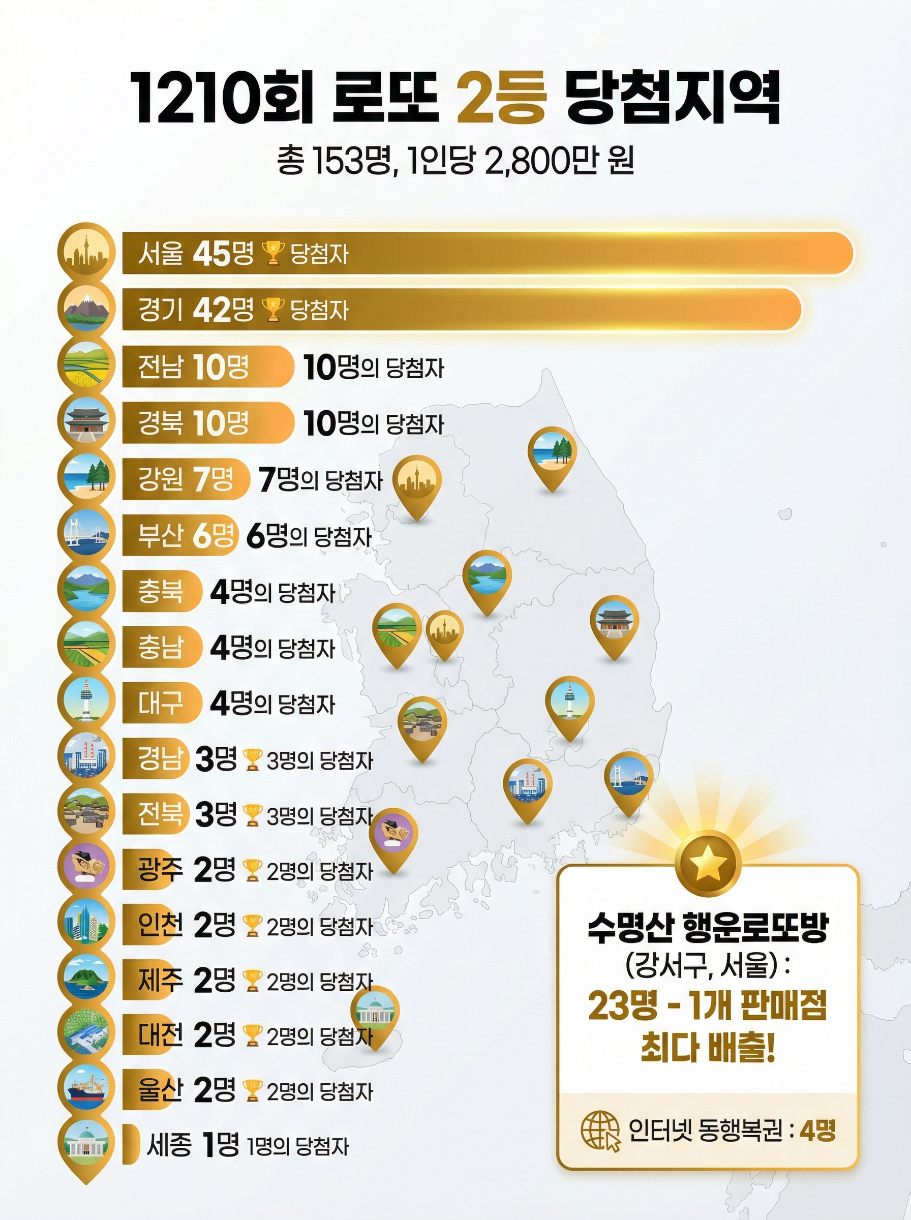 1210회 2등 당첨자는 총 153명으로, 1인당 약 2,800만 원의 당첨금을 수령하였습니다. 지역별 분포를 보면 서울이 45명으로 가장 많았고, 경기도가 42명으로 바로 뒤를 이었습니다.