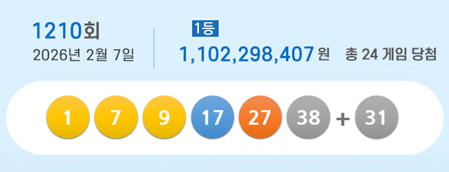 지난 2026년 2월 7일에 추첨된 1210회 로또 당첨번호는 1, 7, 9, 17, 27, 38이었으며, 보너스 번호는 31이었습니다. 이번 회차는 2호기 추첨기에서 진행되었고, 번호 구성을 보면 상당히 흥미로운 패턴이 드러납니다.