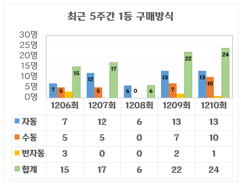 1등 당첨자의 선택 방식을 보면 자동 13명, 수동 10명, 반자동 1명으로, 자동과 수동이 거의 대등한 비율을 보여 주목할 만합니다.
