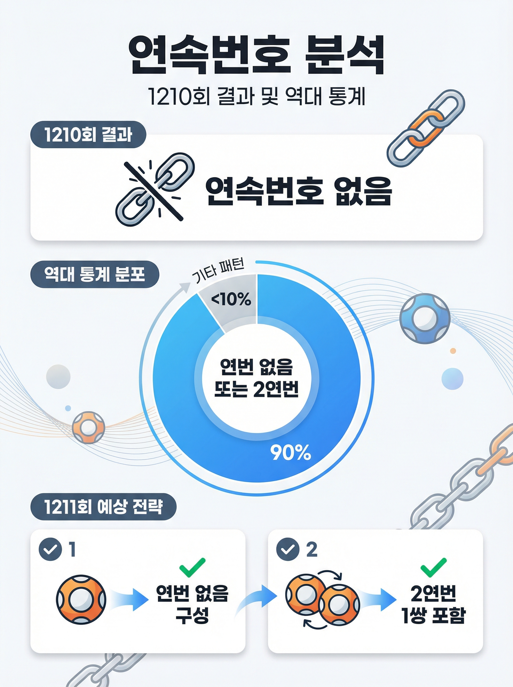 1210회에서는 연속번호(연번)가 없었습니다. 역대 통계를 보면, 연번이 없거나 2연번이 존재하는 경우가 전체의 90% 이상을 차지합니다. 따라서 1211회 예상 조합을 구성할 때도 연번이 없거나, 있다면 2연번 1쌍 정도만 포함하는 것이 합리적입니다.