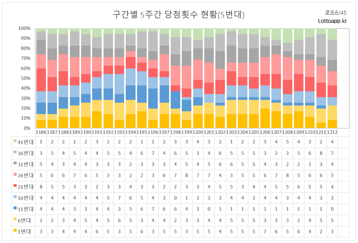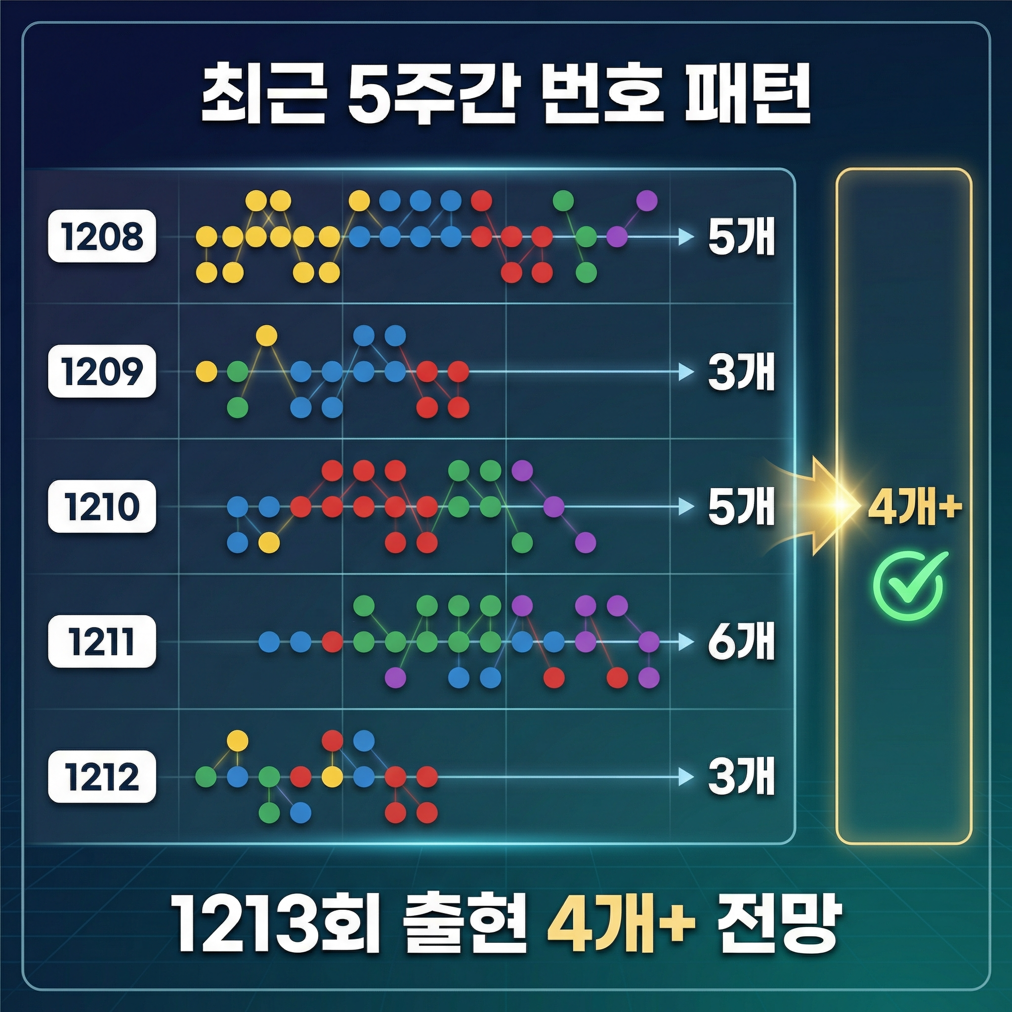 출현번호 일치가 3개인 회차 다음에는 4개 이상으로 반등하는 경향이 보입니다. 따라서 1213회는 5주간 출현번호에서 4개 이상 일치될 것으로 전망됩니다.