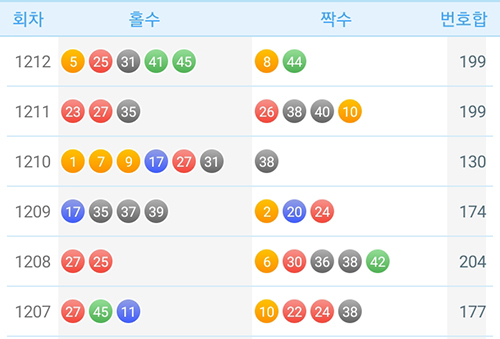 1212회의 홀짝 비율이 5:2(홀수 편향)였으므로, 통계적 회귀 경향에 따라 1213회에서는 짝수 비율이 높아질 가능성이 있습니다.