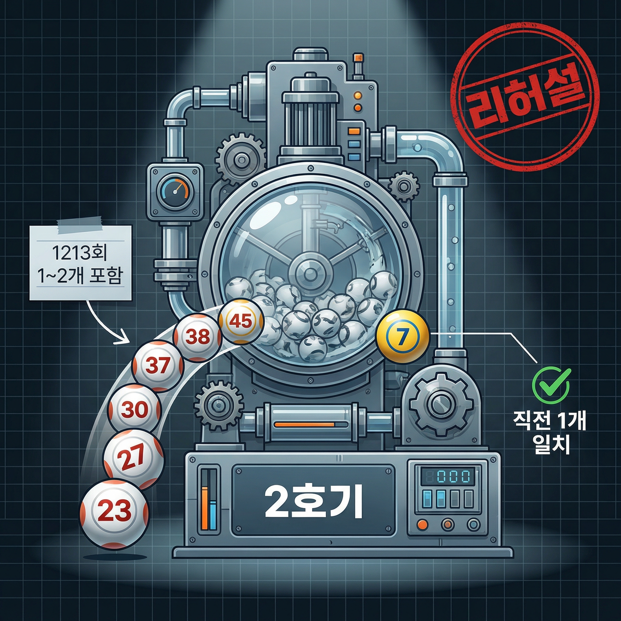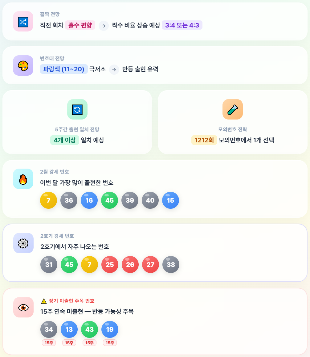 1213회 역시 2호기 추첨기가 계속 사용되며, 2월 마지막 추첨이라는 점에서 월별 통계의 마무리 패턴도 함께 주목해야 합니다. 이번 분석에서는 2월 최다 당첨번호(7번 23회·36번 22회·16번 21회), 2호기 추첨기 강세 번호(31번·45번 각 4회), 최근 5주간 출현·미출현 번호 흐름, 연속쌍 패턴, 홀짝수 비율, 색상별 번호대 분포 등 다양한 통계 기법을 종합 활용하여 예상 방향을 제시합니다.