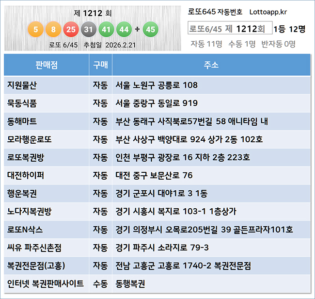 아울러 1212회 1등·2등 당첨지역과 판매점 정보, 그리고 로또645 앱을 활용한 효과적인 번호 생성 방법까지 빠짐없이 정리했으니, 이번주 로또 구매 전 끝까지 읽어보시고 전략 수립에 참고하시기 바랍니다.