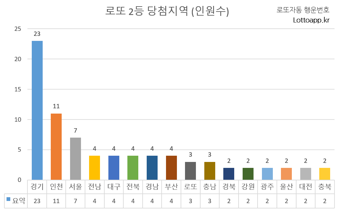 경기도가 23명으로 전체 2등 당첨자의 약 29.1%를 차지하며 압도적 1위를 기록했습니다.