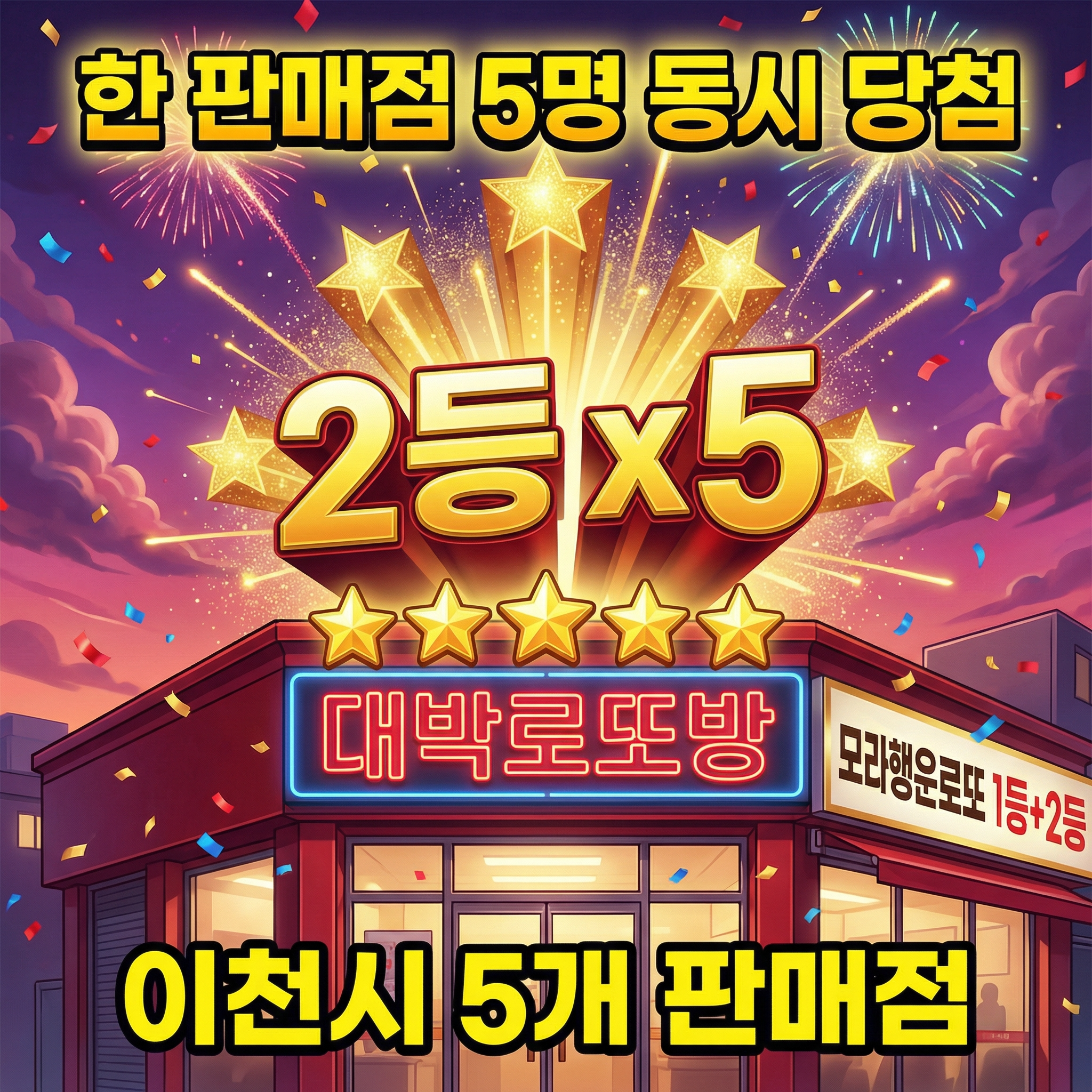 경기 이천시에서는 이천장암로또, 부자상회, 하이랜드, 현대할인마트, 당첨희망복권점 등 5개 판매점에서 2등 당첨자가 배출되어 이천시가 이번 회차의 행운 도시로 떠올랐습니다.